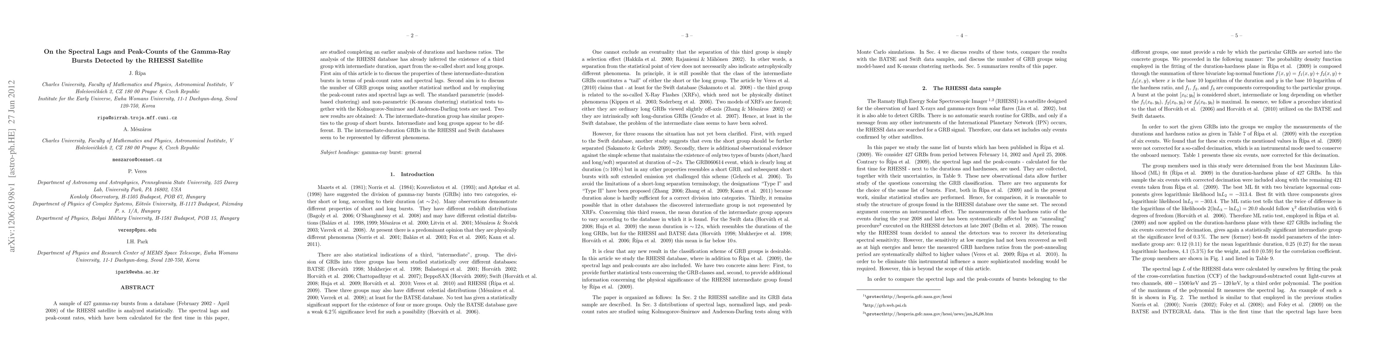 A sample of 427 gamma-ray bursts from a database (February 2002 - April 2008) of the RHESSI satellite is analyzed statistically. The spectral lags and peak-count rates, which have been calculated for the first time in this paper, are studied completing an earlier analysis of durations and hardness ratios. The analysis of the RHESSI database has already inferred the existence of a third group with intermediate duration, apart from the so-called short and long groups. First aim of this article is to discuss the properties of these intermediate-duration bursts in terms of peak-count rates and spectral lags. Second aim is to discuss the number of GRB groups using another statistical method and by employing the peak-count rates and spectral lags as well. The standard parametric (model-based clustering) and non-parametric (K-means clustering) statistical tests together with the Kolmogorov-Smirnov and Anderson-Darling tests are used. Two new results are obtained: A. The intermediate-duration group has similar properties to the group of short bursts. Intermediate and long groups appear to be different. B. The intermediate-duration GRBs in the RHESSI and Swift databases seem to be represented by different phenomena.