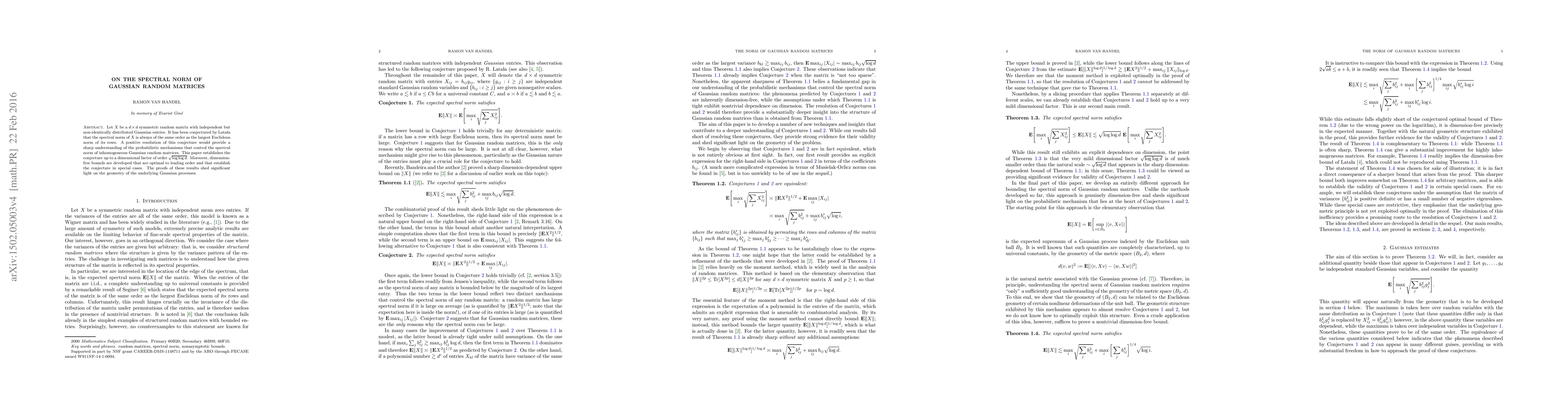 The work resolves a conjecture on the spectral norm of Gaussian random matrices, providing new understanding of the underlying probabilistic mechanisms