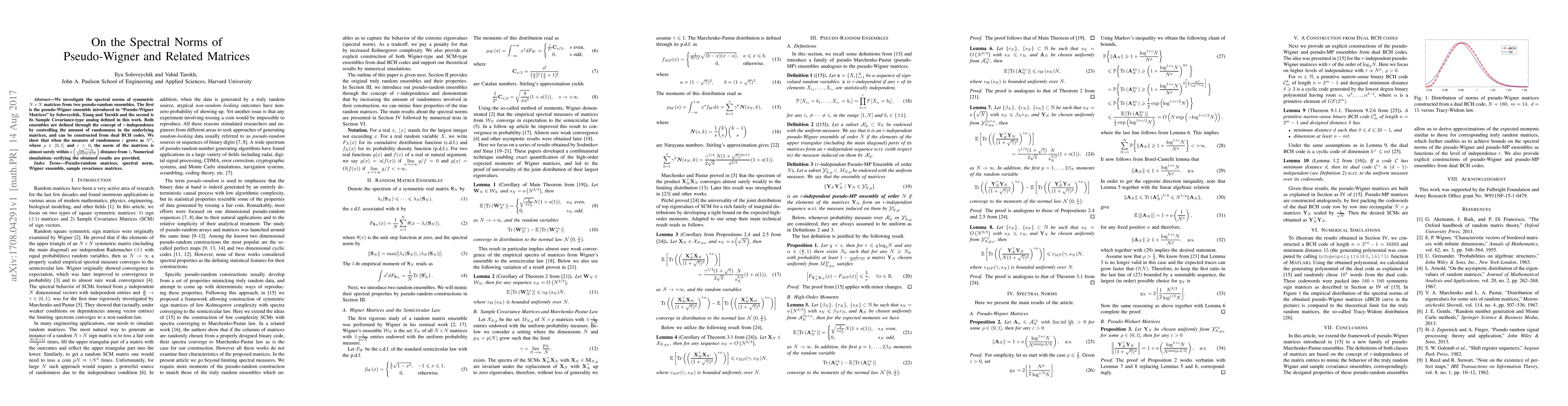 The paper introduces a method to construct pseudo-Wigner and sample covariance-type ensembles from dual BCH codes and derives bounds on their spectral norms using r-independence.