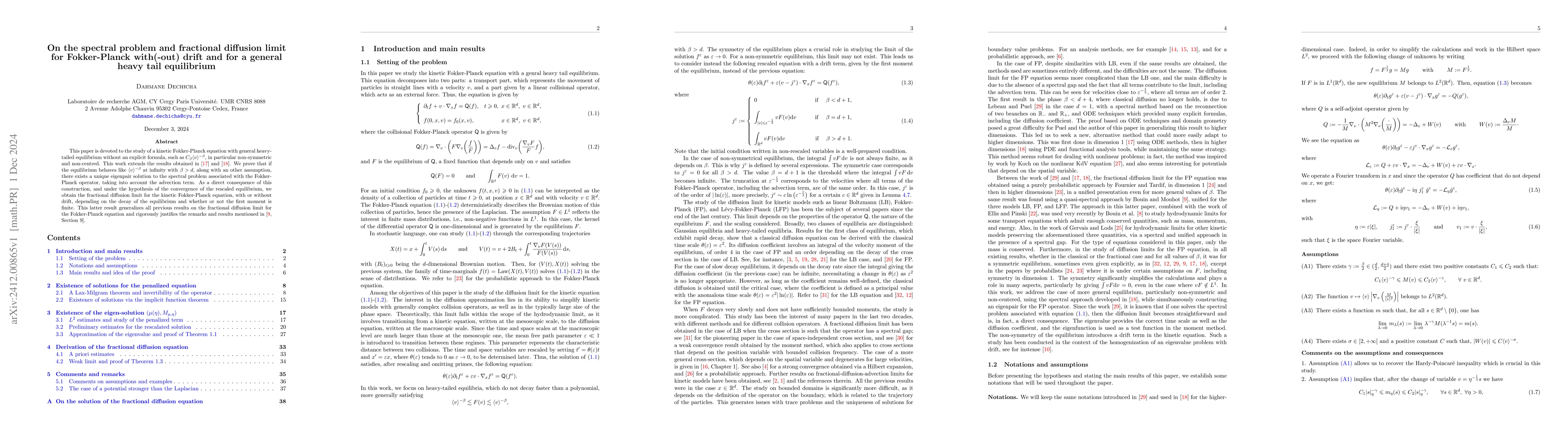 This paper investigates a kinetic Fokker-Planck equation with a general heavy-tailed equilibrium, proving the existence of a unique eigenpair solution to its associated spectral problem. It also establishes the fractional diffusion limit under specific decay conditions, extending prior work and justifying previous remarks on the fractional diffusion limit.