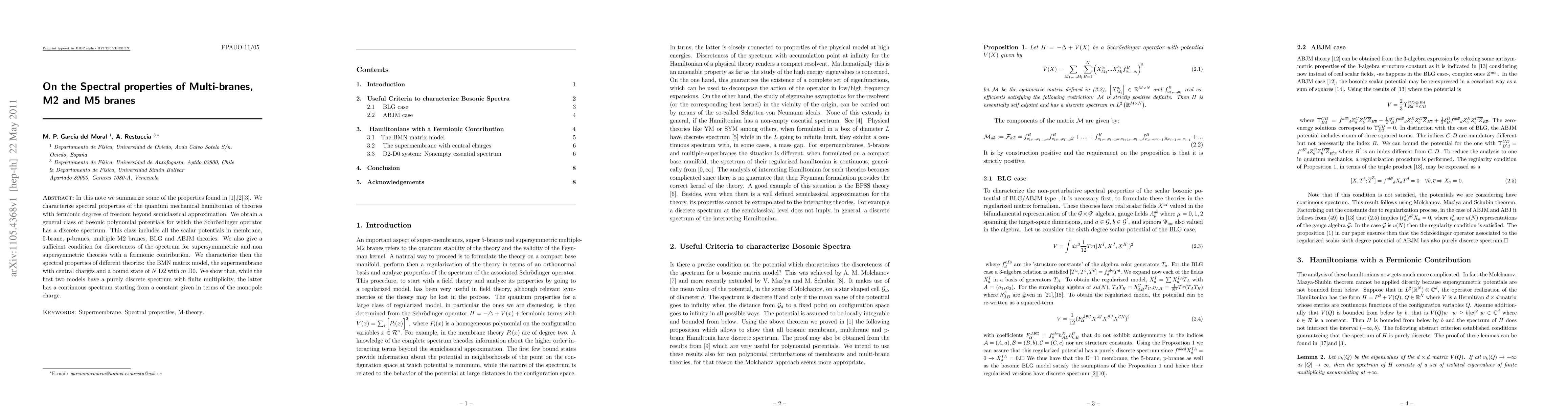 In this note we summarize some of the properties found in several papers. We characterize spectral properties of the quantum mechanical hamiltonian of theories with fermionic degrees of freedom beyond semiclassical approximation. We obtain a general class of bosonic polynomial potentials for which the Schr\"oedinger operator has a discrete spectrum. This class includes all the scalar potentials in membrane, 5-brane, p-branes, multiple M2 branes, BLG and ABJM theories. We also give a sufficient condition for discreteness of the spectrum for supersymmmetric and non supersymmetric theories with a fermionic contribution. We characterize then the spectral properties of different theories: the BMN matrix model, the supermembrane with central charges and a bound state of $N$ D2 with $m$ D0. We show that, while the first two models have a purely discrete spectrum with finite multiplicity, the latter has a continuous spectrum starting from a constant given in terms of the monopole charge.