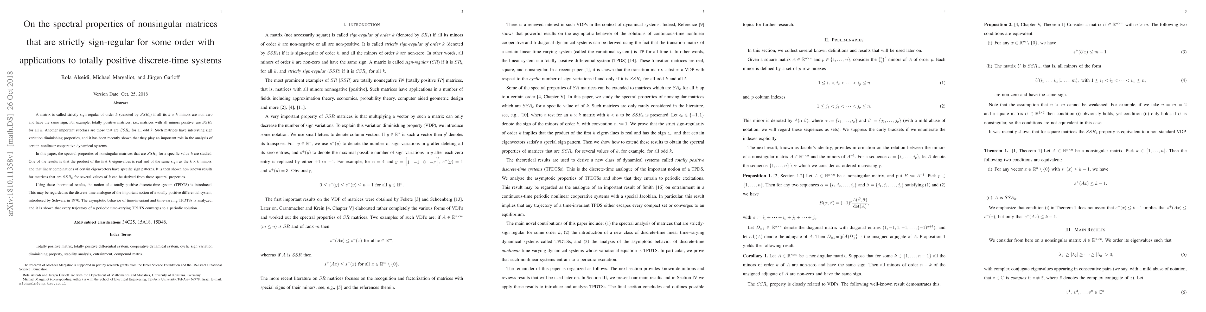 This paper explores the spectral properties of nonsingular matrices that are strictly sign-regular of order $k$ ($SSR_k$), revealing that the product of the first $k$ eigenvalues is real and shares the same sign as the $k\times k$ minors. The findings are applied to analyze the asymptotic behavior of totally positive discrete-time systems, showing periodic convergence for periodic time-varying systems.