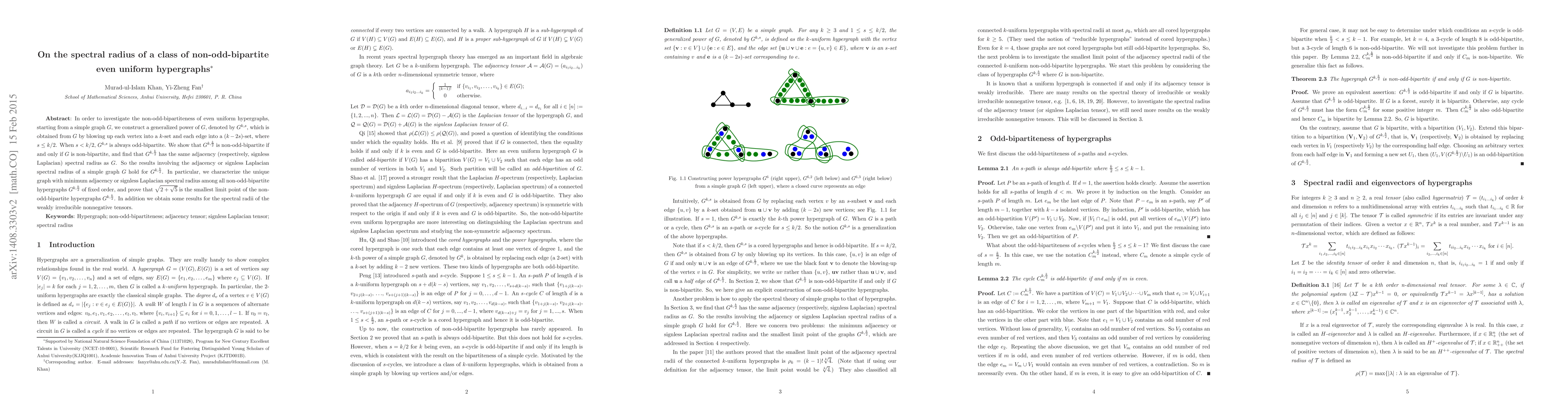 In order to investigate the non-odd-bipartiteness of even uniform hypergraphs, starting from a simple graph $G$, we construct a generalized power of $G$, denoted by $G^{k,s}$, which is obtained from $G$ by blowing up each vertex into a $k$-set and each edge into a $(k-2s)$-set, where $s \le k/2$. When $s < k/2$, $G^{k,s}$ is always odd-bipartite. We show that $G^{k,{k \over 2}}$ is non-odd-bipartite if and only if $G$ is non-bipartite, and find that $G^{k,{k \over 2}}$ has the same adjacency (respectively, signless Laplacian) spectral radius as $G$. So the results involving the adjacency or signless Laplacian spectral radius of a simple graph $G$ hold for $G^{k,{k \over 2}}$. In particular, we characterize the unique graph with minimum adjacency or signless Laplacian spectral radius among all non-odd-bipartite hypergraphs $G^{k,{k \over 2}}$ of fixed order, and prove that $\sqrt{2+\sqrt{5}}$ is the smallest limit point of the non-odd-bipartite hypergraphs $G^{k,{k \over 2}}$. In addition we obtain some results for the spectral radii of the weakly irreducible nonnegative tensors.