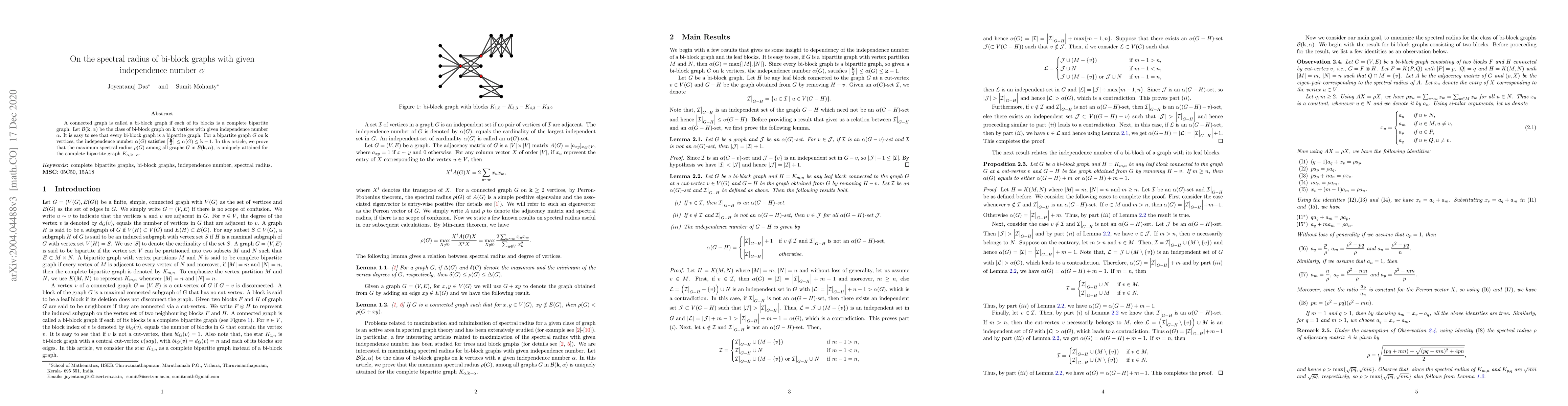 Summary: This paper investigates the spectral radius of bi-block graphs, showing that the maximum spectral radius among bi-block graphs with a given independence number is uniquely achieved by the complete bipartite graph $K_{\alpha, \mathbf{k}-\alpha}$.