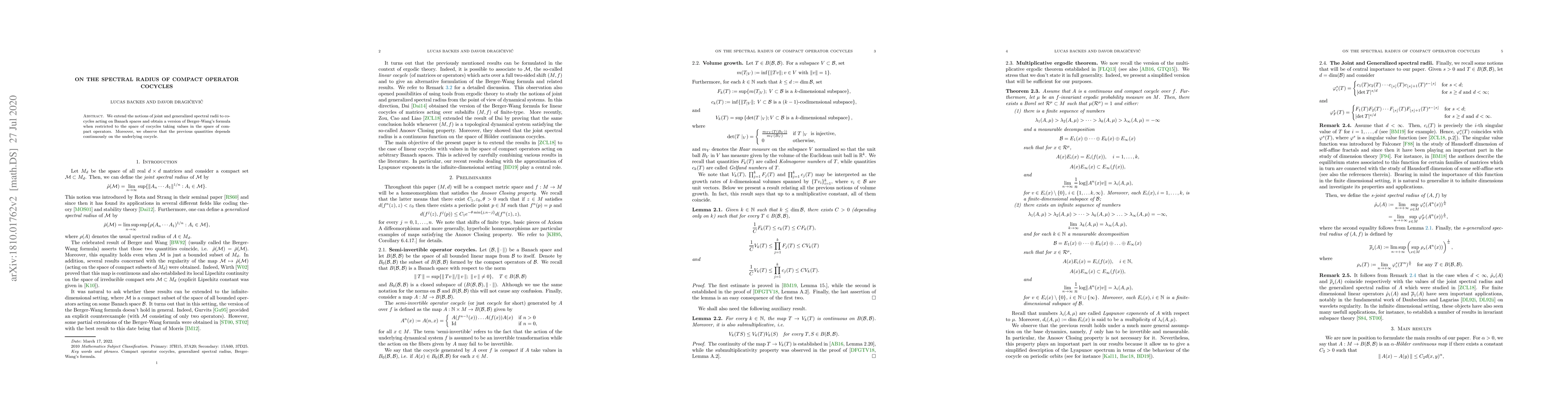 This paper extends joint and generalized spectral radii concepts to cocycles on Banach spaces, providing a Berger-Wang formula for compact operator cocycles, and demonstrates the continuous dependence of these quantities on the cocycle.