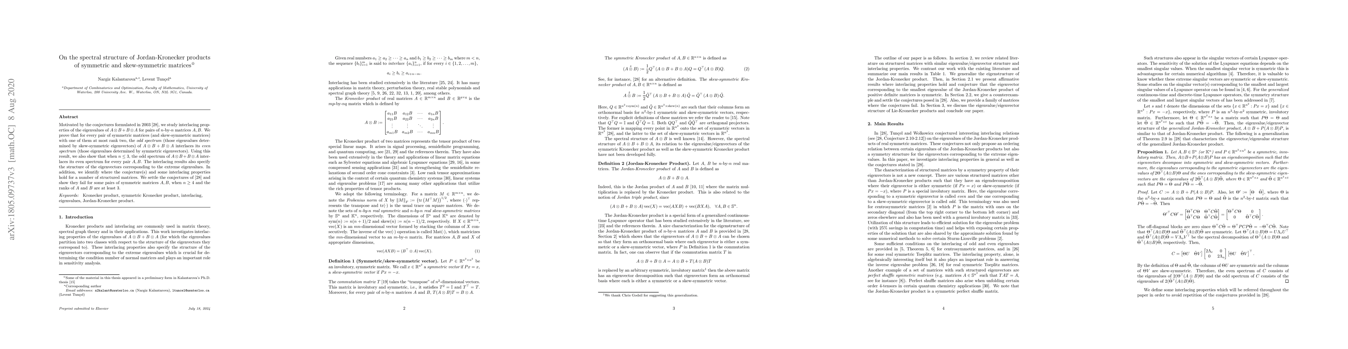 Researchers study the interlacing properties of eigenvalues from Jordan-Kronecker products of symmetric and skew-symmetric matrices, settling a conjecture while also finding exceptions for higher-dimensional matrices.