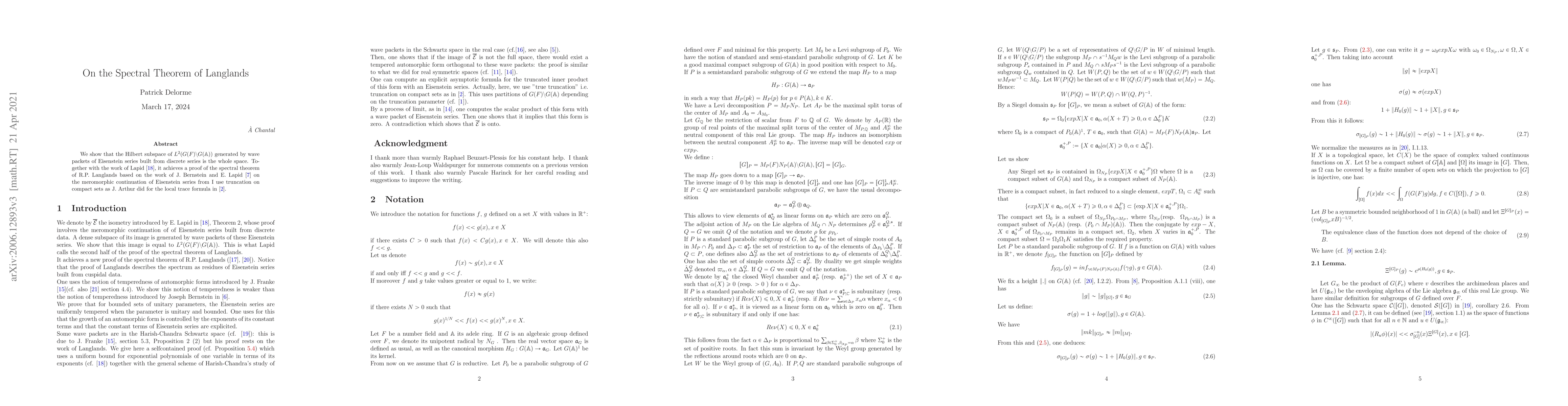 We show that the Hilbert subspace of $L^2(G(F)\backslash G(\A))$ generated by wave packets of Eisenstein series built from discrete series is the whole space. Together with the work of Lapid \cite{L1}, it achieves a proof of the spectral theorem of Langlands based on the work of Bernstein and Lapid \cite{BL} on the meromorphic continuation of Eisenstein series. I have to say that I was unable to complete the proof of an earlier version. Instead, I use truncation on compact sets, as Arthur did to prove the Local Trace Formula in \cite{Alt}.
