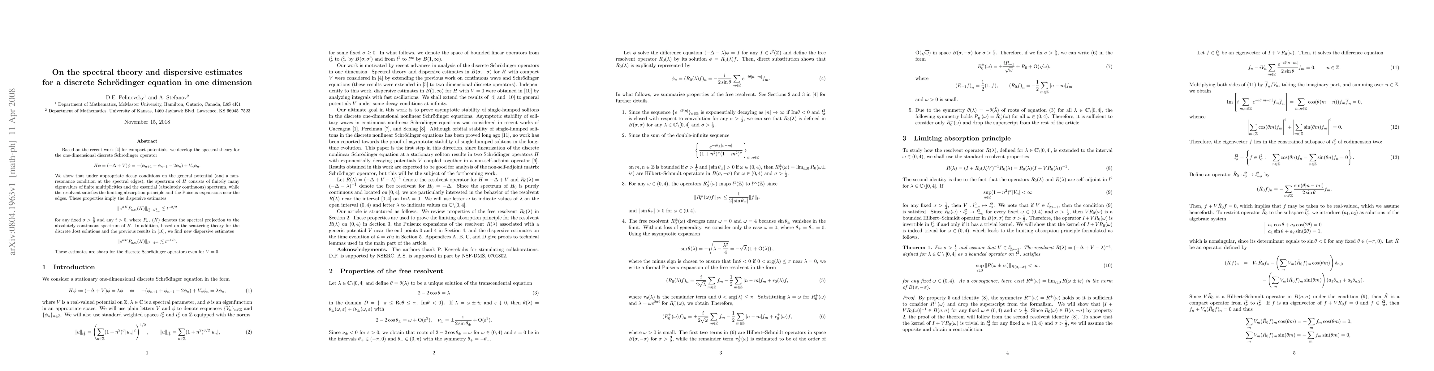 This paper develops the spectral theory for a one-dimensional discrete Schrödinger operator under general potential decay conditions, showing it has finitely many eigenvalues and an essential spectrum. It proves dispersive estimates for the operator, including $$ \|e^{i t H} P_{\rm a.c.}(H)\|_{l^2_{\sigma} \to l^2_{-\sigma}} \lesssim t^{-3/2} $$ and $$ \|e^{i t H} P_{\rm a.c.}(H)\|_{l^1\to l^\infty}\lesssim t^{-1/3}, $$ which are sharp even for zero potential.