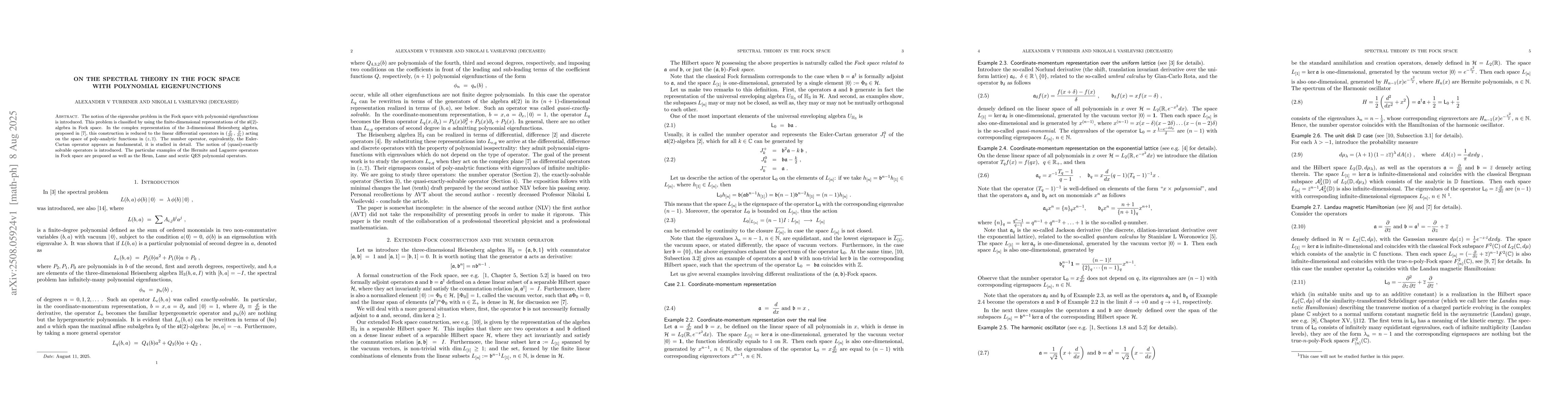 The notion of the eigenvalue problem in the Fock space with polynomial eigenfunctions is introduced. This problem is classified by using the finite-dimensional representations of the $\mathfrak{sl}(2)$-algebra in Fock space. In the complex representation of the 3-dimensional Heisenberg algebra, proposed by Turbiner-Vasilevski (2021) in Ref.7, this construction is reduced to the linear differential operators in $(\frac{\partial}{\partial \overline{z}}\,,\,\frac{\partial}{\partial z})$ acting on the space of poly-analytic functions in $(z,\overline{z})$. The number operator, equivalently, the Euler-Cartan operator appears as fundamental, it is studied in detail. The notion of (quasi)-exactly solvable operators is introduced. The particular examples of the Hermite and Laguerre operators in Fock space are proposed as well as the Heun, Lame and sextic QES polynomial operators.