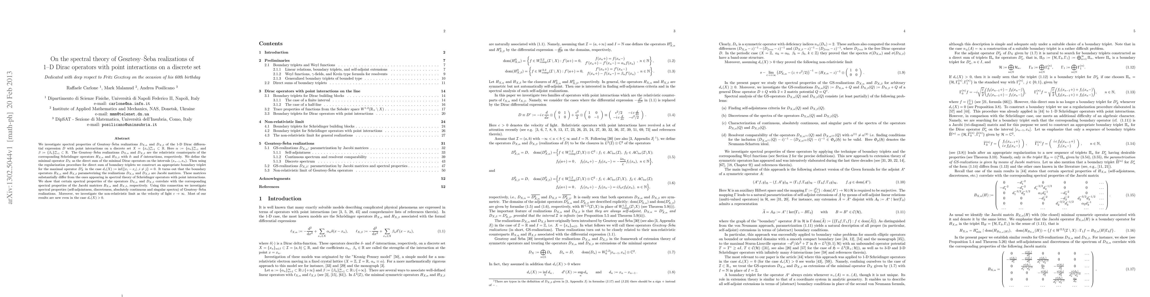 We investigate spectral properties of Gesztesy-\v{S}eba realizations D_{X,\alpha} and D_{X,\beta} of the 1-D Dirac differential expression D with point interactions on a discrete set $X=\{x_n\}_{n=1}^\infty\subset \mathbb{R}.$ Here $\alpha := \{\alpha_{n}\}_{n=1}^\infty$ and \beta :=\{\beta_{n}\}_{n=1}^\infty \subset\mathbb{R}. The Gesztesy-\v{S}eba realizations $D_{X,\alpha}$ and $D_{X,\beta}$ are the relativistic counterparts of the corresponding Schr\"odinger operators $H_{X,\alpha}$ and $H_{X,\beta}$ with $\delta$- and $\delta'$-interactions, respectively. We define the minimal operator D_X as the direct sum of the minimal Dirac operators on the intervals $(x_{n-1}, x_n)$. Then using the regularization procedure for direct sum of boundary triplets we construct an appropriate boundary triplet for the maximal operator $D_X^*$ in the case $d_*(X):=\inf\{|x_i-x_j| \,, i\not=j\} = 0$. It turns out that the boundary operators $B_{X,\alpha}$ and $B_{X,\beta}$ parameterizing the realizations D_{X,\alpha} and D_{X,\beta} are Jacobi matrices. These matrices substantially differ from the ones appearing in spectral theory of Schr\"odinger operators with point interactions. We show that certain spectral properties of the operators $D_{X,\alpha}$ and $D_{X,\beta}$ correlate with the corresponding spectral properties of the Jacobi matrices $B_{X,\alpha}$ and $B_{X,\beta}$, respectively. Using this connection we investigate spectral properties (self-adjointness, discreteness, absolutely continuous and singular spectra) of Gesztesy--{\vS}eba realizations. Moreover, we investigate the non-relativistic limit as the velocity of light $c\to\infty$. Most of our results are new even in the case $d_*(X)> 0.$