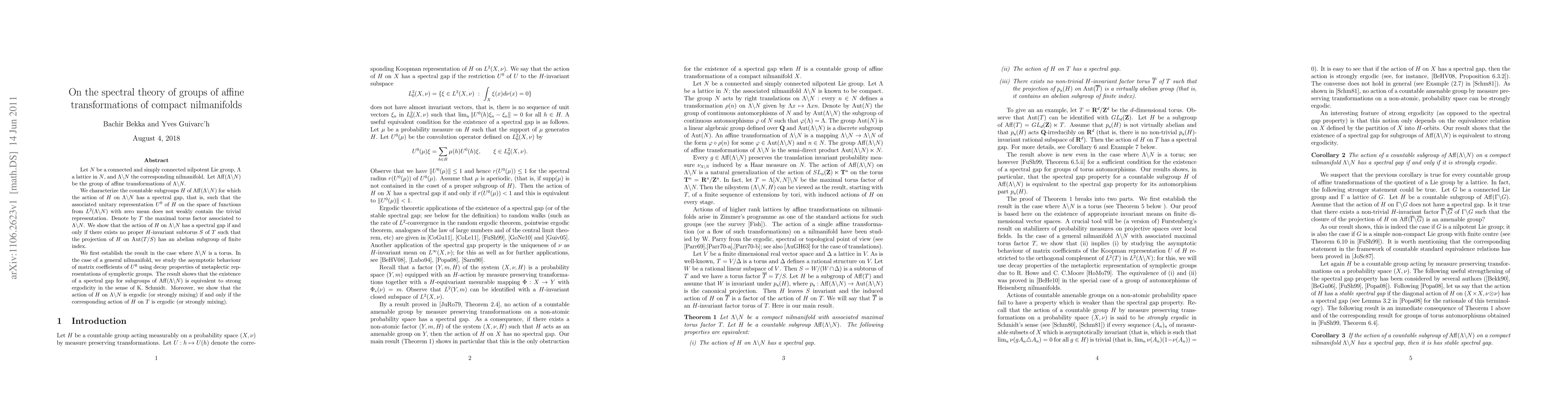 Let $N$ be a connected and simply connected nilpotent Lie group, $\Lambda$ a lattice in $N$, and $X=N/\Lambda$ the corresponding nilmanifold. Let $Aff(X)$ be the group of affine transformations of $X$. We characterize the countable subgroups $H$ of $Aff(X)$ for which the action of $H$ on $X$ has a spectral gap, that is, such that the associated unitary representation $U$ of $H$ on the space of functions from $L^2(X)$ with zero mean does not weakly contain the trivial representation. Denote by $T$ the maximal torus factor associated to $X$. We show that the action of $H$ on $X$ has a spectral gap if and only if there exists no proper $H$-invariant subtorus $S$ of $T$ such that the projection of $H$ on $Aut (T/S)$ has an abelian subgroup of finite index. We first establish the result in the case where $X$ is a torus. In the case of a general nilmanifold, we study the asymptotic behaviour of matrix coefficients of $U$ using decay properties of metaplectic representations of symplectic groups. The result shows that the existence of a spectral gap for subgroups of $Aff(X)$ is equivalent to strong ergodicity in the sense of K.Schmidt. Moreover, we show that the action of $H$ on $X$ is ergodic (or strongly mixing) if and only if the corresponding action of $H$ on $T$ is ergodic (or strongly mixing).