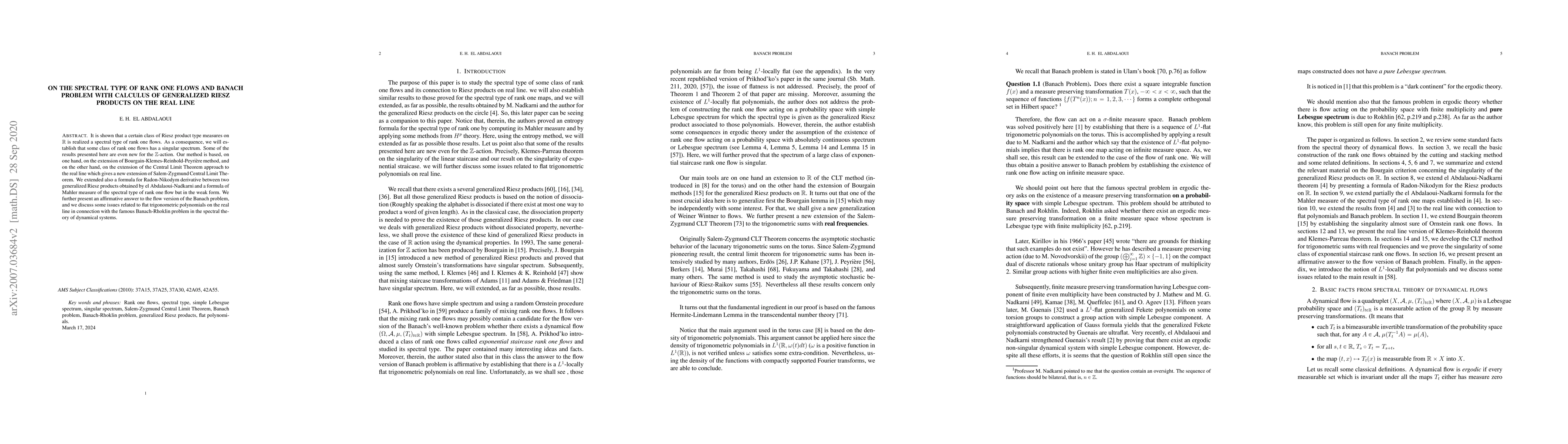 It is shown that a certain class of Riesz product type measures on $\mathbb{R}$ is realized a spectral type of rank one flows. As a consequence, we will establish that some class of rank one flows has a singular spectrum. Some of the results presented here are even new for the $\mathbb{Z}$-action. Our method is based, on one hand, on the extension of Bourgain-Klemes-Reinhold-Peyri\`ere method, and on the other hand, on the extension of the Central Limit Theorem approach to the real line which gives a new extension of Salem-Zygmund Central Limit Theorem. We extended also a formula for Radon-Nikodym derivative between two generalized Riesz products obtained by el Abdalaoui-Nadkarni and a formula of Mahler measure of the spectral type of rank one flow but in the weak form. We further present an affirmative answer to the flow version of the Banach problem, and we discuss some issues related to flat trigonometric polynomials on the real line in connection with the famous Banach-Rhoklin problem in the spectral theory of dynamical systems.