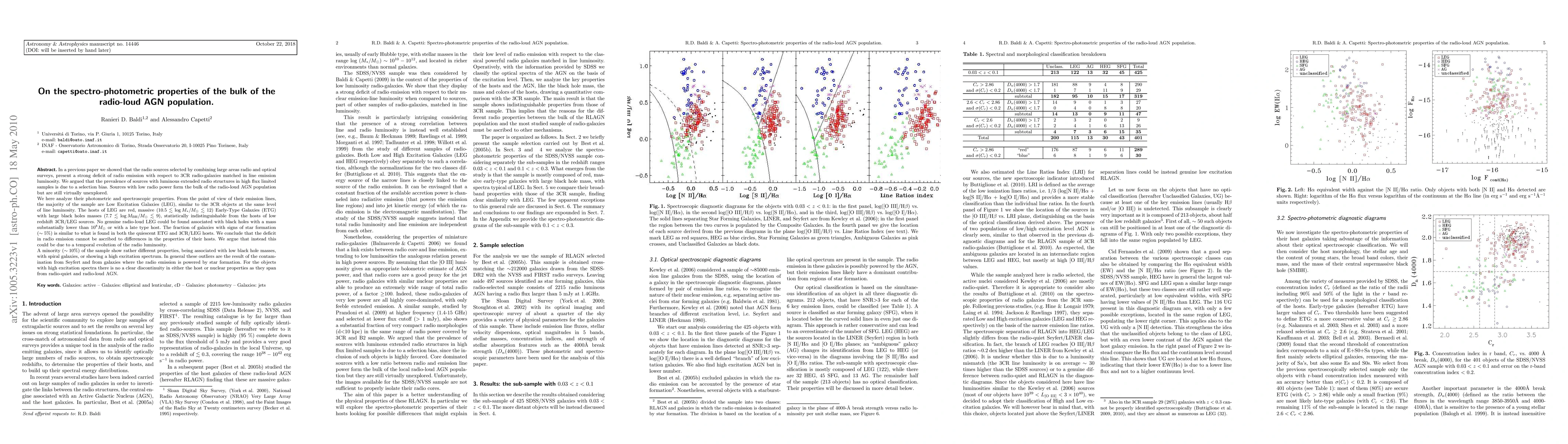 In a previous paper we showed that the radio sources selected by combining large areas radio and optical surveys, present a strong deficit of radio emission with respect to 3CR radio-galaxies matched in line emission luminosity. We argued that the prevalence of sources with luminous extended radio structures in high flux limited samples is due to a selection bias. Sources with low radio power form the bulk of the radio-loud AGN population but are still virtually unexplored. We here analyze their photometric and spectroscopic properties. From the point of view of their emission lines, the majority of the sample are Low Excitation Galaxies (LEG), similar to the 3CR objects at the same level of line luminosity. The hosts of LEG are red, massive Early-Type Galaxies (ETG) with large black holes masses , statistically indistinguishable from the hosts of low redshift 3CR/LEG sources. No genuine radio-loud LEG could be found associated with black holes with a mass substantially lower than 10^8 M(sun) or with a late type host. The fraction of galaxies with signs of star formation (5%) is similar to what is found in both the quiescent ETG and 3CR/LEG hosts. We conclude that the deficit in radio emission cannot be ascribed to differences in the properties of their hosts. We argue that instead this could be due to a temporal evolution of the radio luminosity. A minority (10%) of the sample show rather different properties, being associated with low black hole masses, with spiral galaxies, or showing a high excitation spectrum. In general these outliers are the result of the contamination from Seyfert and from galaxies where the radio emission is powered by star formation. For the objects with high excitation spectra there is no a clear discontinuity in either the host or nuclear properties as they span from radio-quiet and radio-loud AGN.
