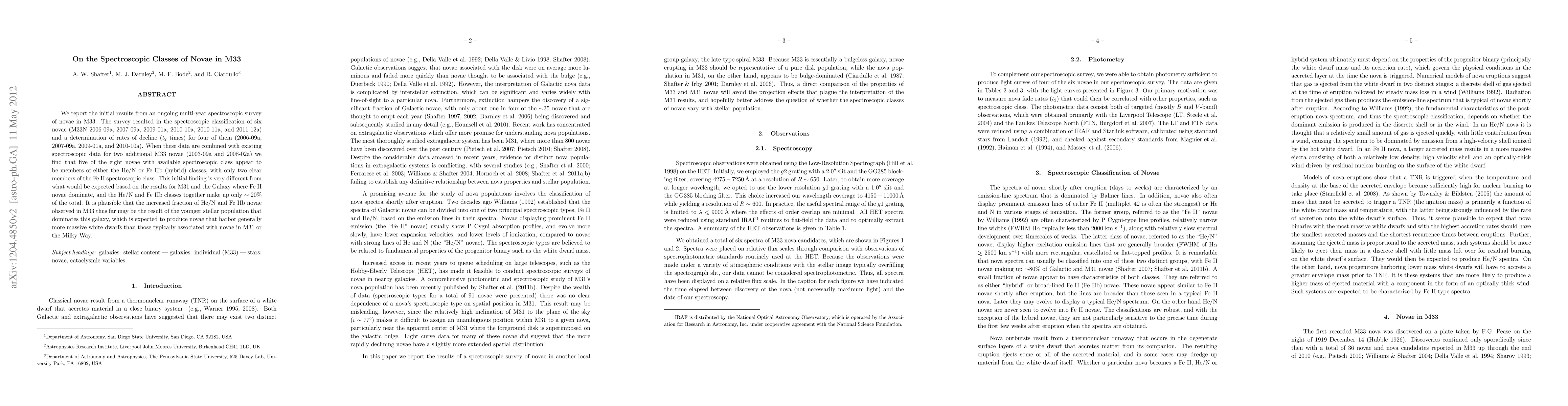 This study classifies six novae in M33 spectroscopically and finds that five out of eight novae belong to the He/N or Fe IIb classes, contrasting with the dominance of Fe II novae in M31 and the Milky Way. The results suggest a possible correlation with M33's younger stellar population producing more massive white dwarfs.
