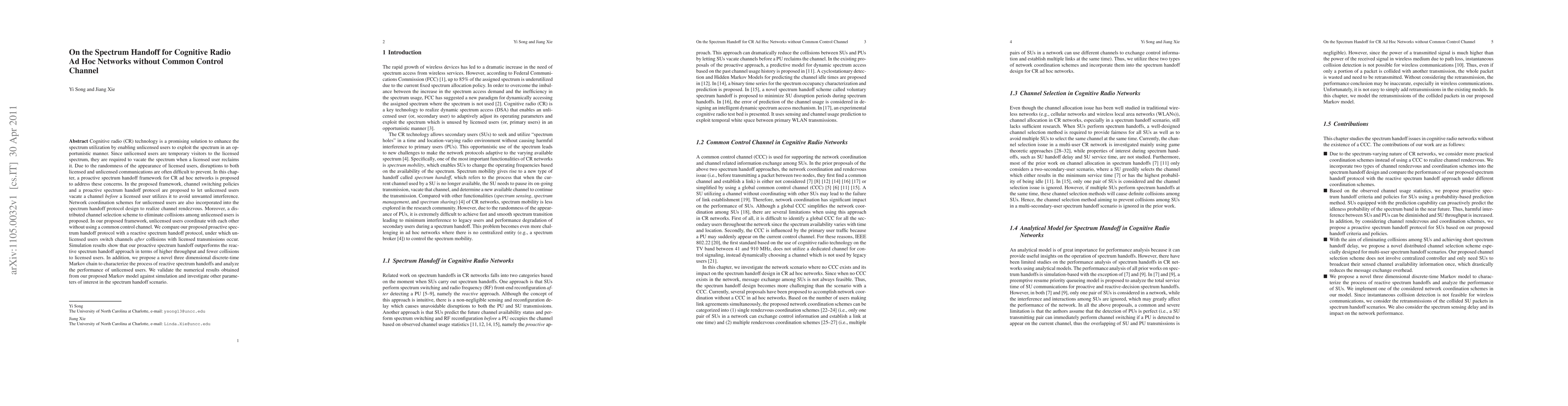 Cognitive radio (CR) technology is a promising solution to enhance the spectrum utilization by enabling unlicensed users to exploit the spectrum in an opportunistic manner. Since unlicensed users are temporary visitors to the licensed spectrum, they are required to vacate the spectrum when a licensed user reclaims it. Due to the randomness of the appearance of licensed users, disruptions to both licensed and unlicensed communications are often difficult to prevent. In this chapter, a proactive spectrum handoff framework for CR ad hoc networks is proposed to address these concerns. In the proposed framework, channel switching policies and a proactive spectrum handoff protocol are proposed to let unlicensed users vacate a channel before a licensed user utilizes it to avoid unwanted interference. Network coordination schemes for unlicensed users are also incorporated into the spectrum handoff protocol design to realize channel rendezvous. Moreover, a distributed channel selection scheme to eliminate collisions among unlicensed users is proposed. In our proposed framework, unlicensed users coordinate with each other without using a common control channel. We compare our proposed proactive spectrum handoff protocol with a reactive spectrum handoff protocol, under which unlicensed users switch channels after collisions with licensed transmissions occur. Simulation results show that our proactive spectrum handoff outperforms the reactive spectrum handoff approach in terms of higher throughput and fewer collisions to licensed users. In addition, we propose a novel three dimensional discrete-time Markov chain to characterize the process of reactive spectrum handoffs and analyze the performance of unlicensed users. We validate the numerical results obtained from our proposed Markov model against simulation and investigate other parameters of interest in the spectrum handoff scenario.