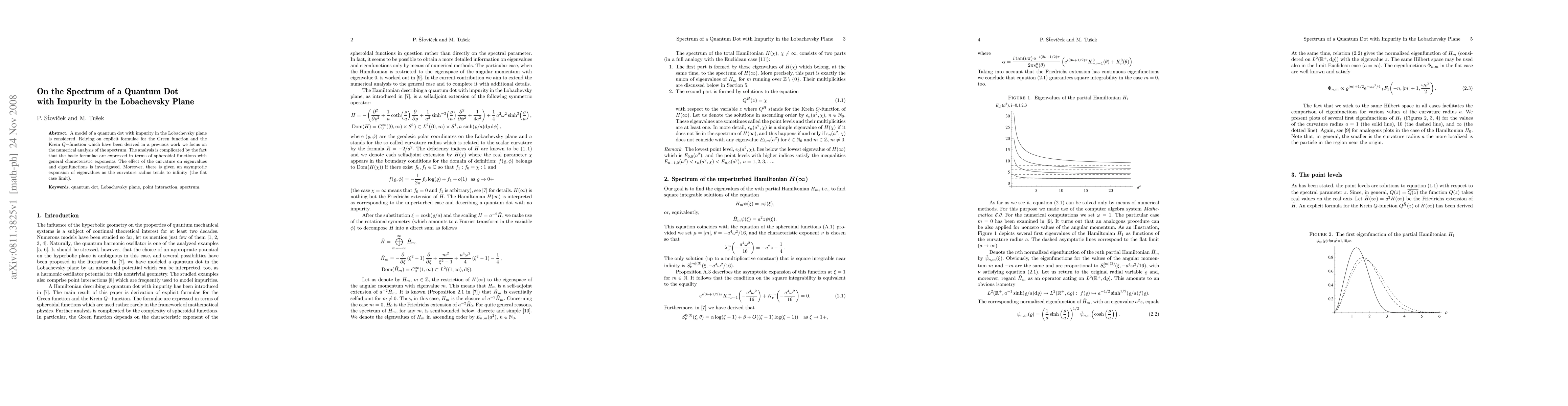 A model of a quantum dot with impurity in the Lobachevsky plane is considered. Relying on explicit formulae for the Green function and the Krein $Q-$function which have been derived in a previous work we focus on the numerical analysis of the spectrum. The analysis is complicated by the fact that the basic formulae are expressed in terms of spheroidal functions with general characteristic exponents. The effect of the curvature on eigenvalues and eigenfunctions is investigated. Moreover, there is given an asymptotic expansion of eigenvalues as the curvature radius tends to infinity (the flat case limit).