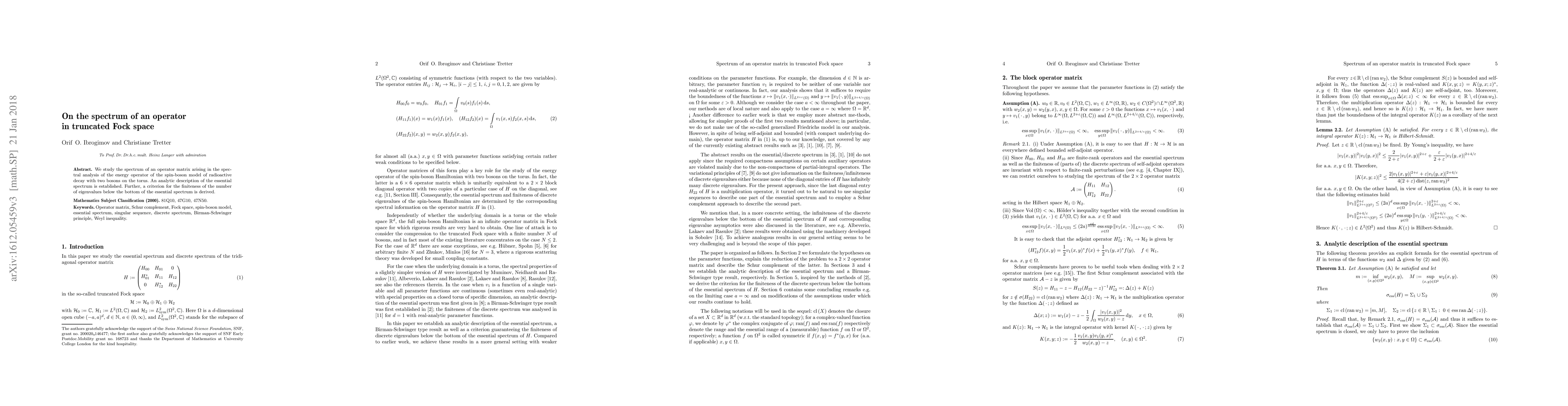 This research paper presents an analytic description of the essential spectrum for an operator matrix in the truncated Fock space, relevant to the spin-boson model of radioactive decay with two bosons on the torus. It also provides a criterion to determine if the number of eigenvalues below the essential spectrum's lowest point is finite.