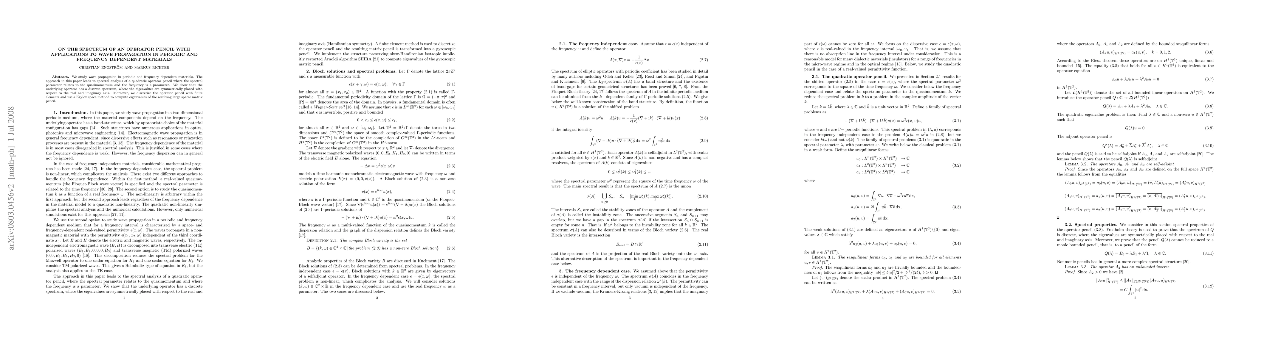 We study wave propagation in periodic and frequency dependent materials. The approach in this paper leads to spectral analysis of a quadratic operator pencil where the spectral parameter relates to the quasimomentum and the frequency is a parameter. We show that the underlying operator has a discrete spectrum, where the eigenvalues are symmetrically placed with respect to the real and imaginary axis. Moreover, we discretize the operator pencil with finite elements and use a Krylov space method to compute eigenvalues of the resulting large sparse matrix pencil.