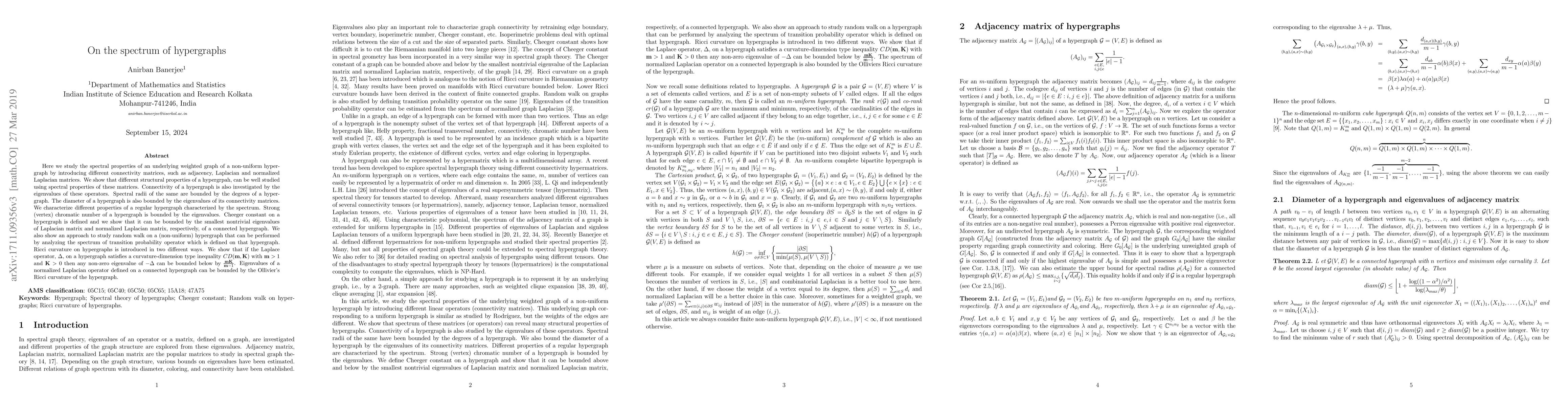 A study on the spectral properties of non-uniform hypergraphs explores how different structural properties can be analyzed using eigenvalues of connectivity matrices, offering insights into graph connectivity, chromatic number, Cheeger constant, and Ricci curvature.
