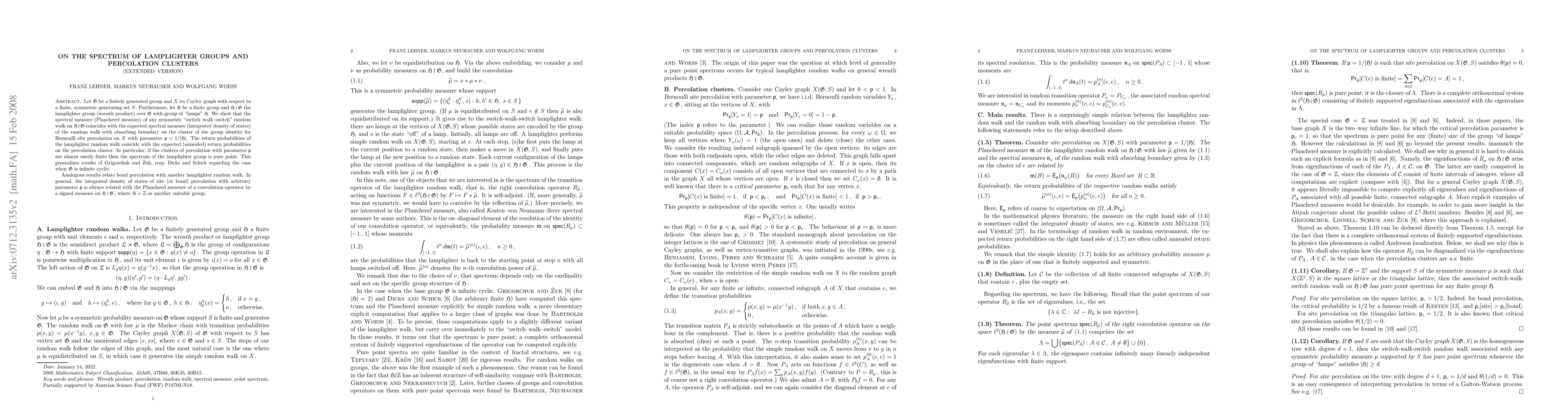 A study on lamplighter groups and percolation clusters shows that random walks on these structures have similar spectral measures as expected values of certain percolation models, with implications for the spectrum of the lamplighter group.