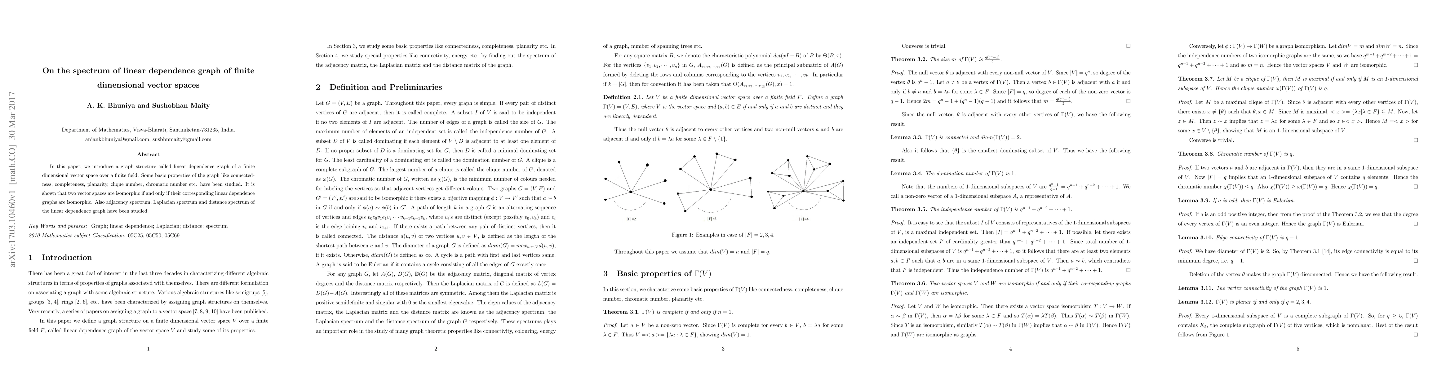 In this paper, we introduce a graph structure called linear dependence graph of a finite dimensional vector space over a finite field. Some basic properties of the graph like connectedness, completeness, planarity, clique number, chromatic number etc. have been studied. It is shown that two vector spaces are isomorphic if and only if their corresponding linear dependence graphs are isomorphic. Also adjacency spectrum, Laplacian spectrum and distance spectrum of the linear dependence graph have been studied.