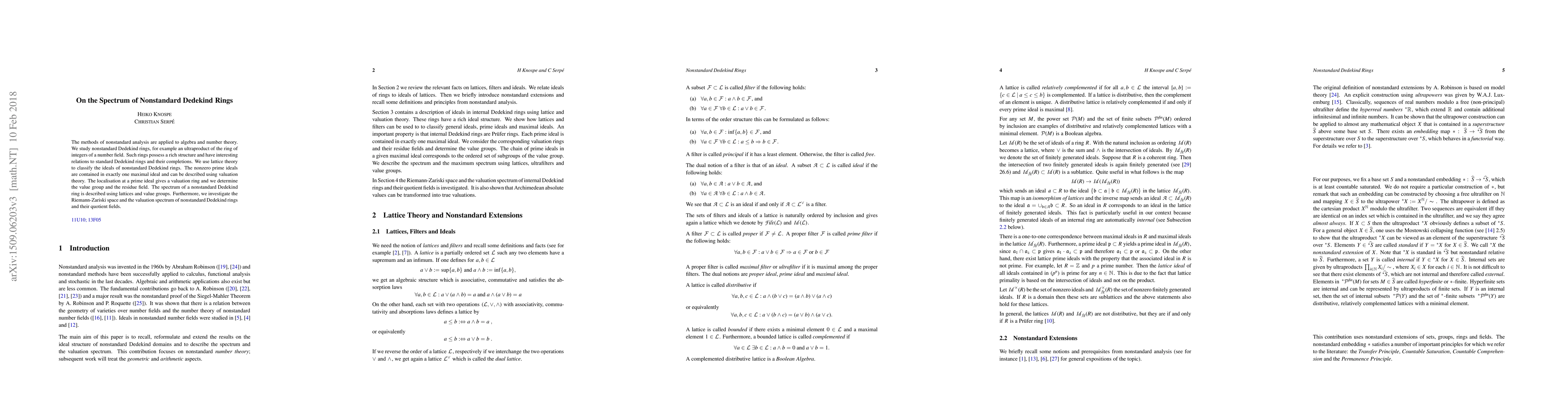 This paper employs nonstandard analysis to explore nonstandard Dedekind rings, revealing their complex structure and relations to standard Dedekind rings. It uses lattice theory to classify their ideals and valuation theory to describe the spectrum, including the Riemann-Zariski space and valuation spectrum.