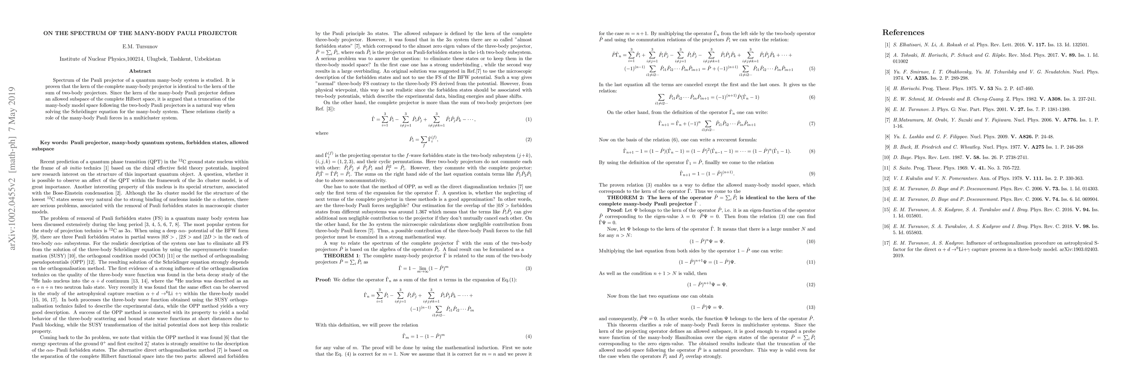 Spectrum of the Pauli projector of a quantum many-body system is studied. It is proven that the kern of the complete many-body projector is identical to the kern of the sum of two-body projectors. Since the kern of the many-body Pauli projector defines an allowed subspace of the complete Hilbert space, it is argued that a truncation of the many-body model space following the two-body Pauli projectors is a natural way when solving the Schr\"{o}dinger equation for the many-body system. These relations clarify a role of the many-body Pauli forces in a multicluster system.