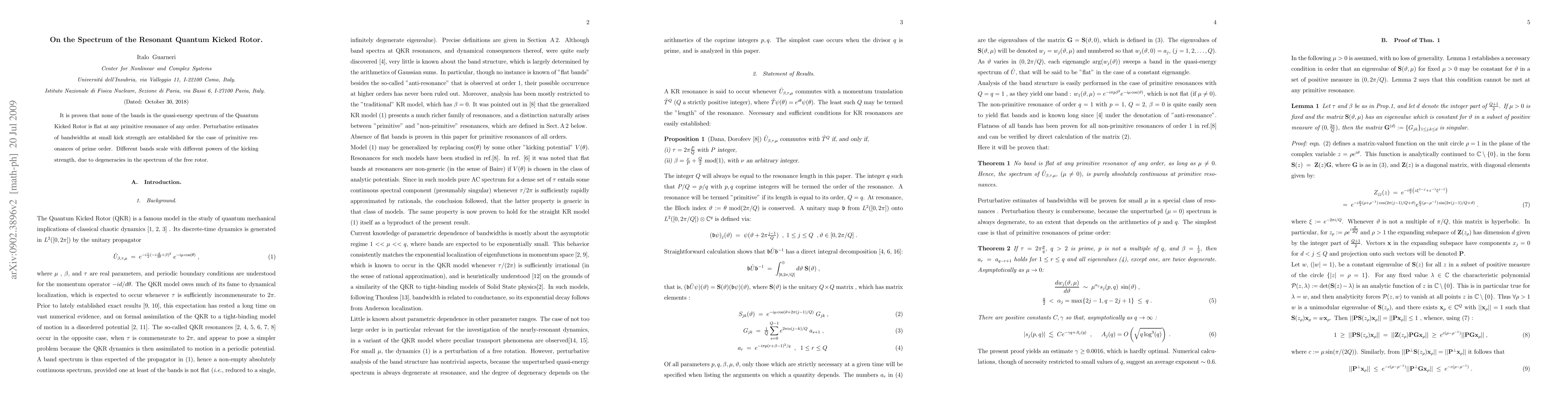 This paper demonstrates that no quasi-energy bands in the Quantum Kicked Rotor are flat at any primitive resonance, and it provides perturbative estimates for bandwidths at small kick strengths, particularly for prime-order resonances, noting different scaling behaviors due to free rotor spectrum degeneracies.
