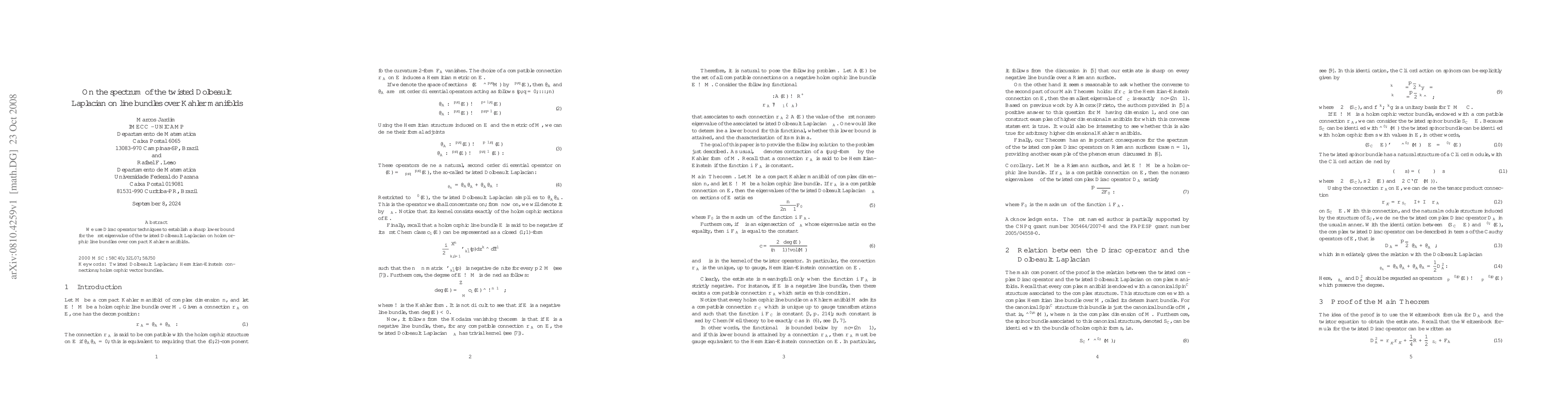 Summary: This paper establishes a sharp lower bound for the first eigenvalue of the twisted Dolbeault Laplacian on holomorphic line bundles over compact Kähler manifolds using Dirac operator techniques. The results contribute to the understanding of spectral properties on these geometric structures.