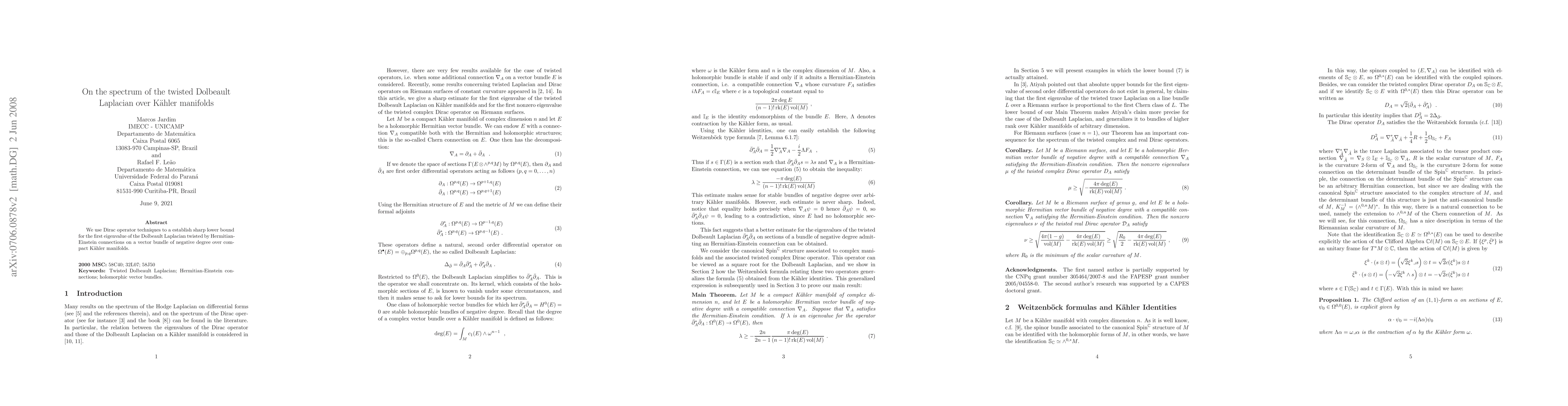 This paper establishes a sharp lower bound for the first eigenvalue of the twisted Dolbeault Laplacian on Kähler manifolds using Dirac operator techniques, focusing on vector bundles of negative degree with Hermitian-Einstein connections.