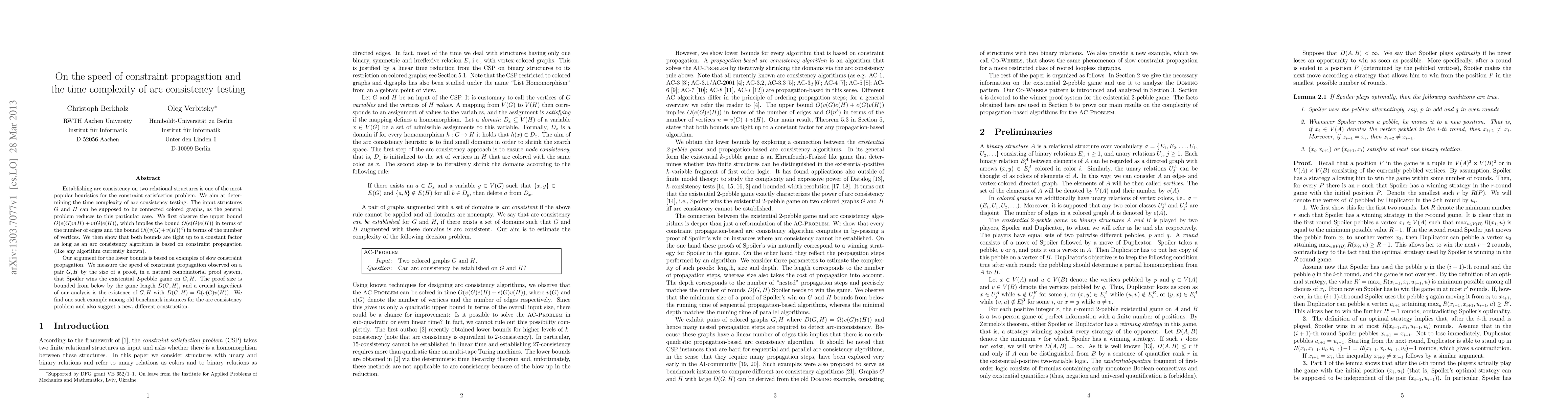 Establishing arc consistency on two relational structures is one of the most popular heuristics for the constraint satisfaction problem. We aim at determining the time complexity of arc consistency testing. The input structures $G$ and $H$ can be supposed to be connected colored graphs, as the general problem reduces to this particular case. We first observe the upper bound $O(e(G)v(H)+v(G)e(H))$, which implies the bound $O(e(G)e(H))$ in terms of the number of edges and the bound $O((v(G)+v(H))^3)$ in terms of the number of vertices. We then show that both bounds are tight up to a constant factor as long as an arc consistency algorithm is based on constraint propagation (like any algorithm currently known). Our argument for the lower bounds is based on examples of slow constraint propagation. We measure the speed of constraint propagation observed on a pair $G,H$ by the size of a proof, in a natural combinatorial proof system, that Spoiler wins the existential 2-pebble game on $G,H$. The proof size is bounded from below by the game length $D(G,H)$, and a crucial ingredient of our analysis is the existence of $G,H$ with $D(G,H)=\Omega(v(G)v(H))$. We find one such example among old benchmark instances for the arc consistency problem and also suggest a new, different construction.