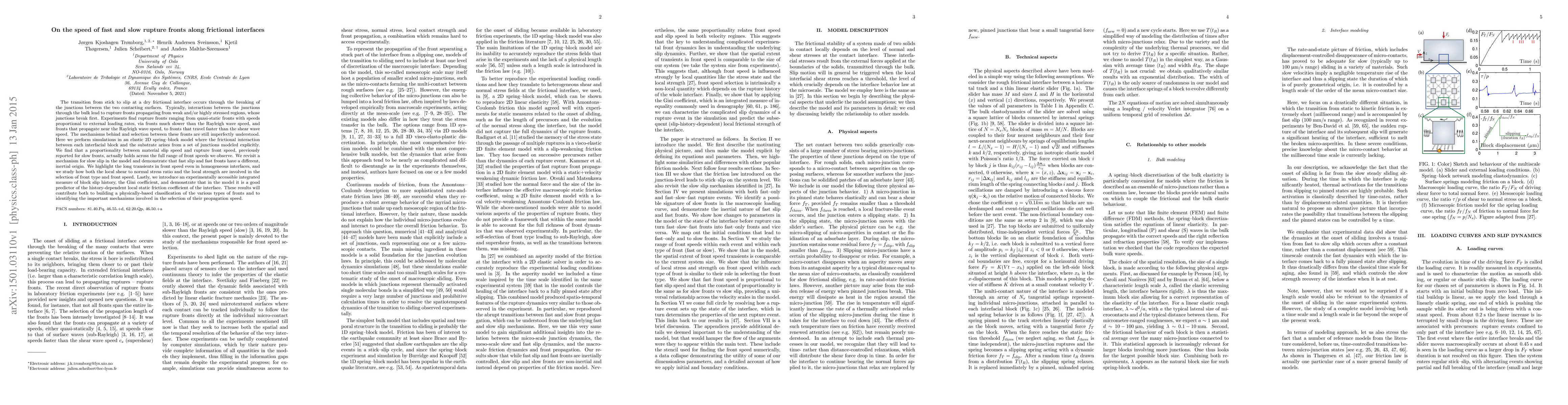 The transition from stick to slip at a dry frictional interface occurs through the breaking of the junctions between the two contacting surfaces. Typically, interactions between the junctions through the bulk lead to rupture fronts propagating from weak and/or highly stressed regions, whose junctions break first. Experiments find rupture fronts ranging from quasi-static fronts with speeds proportional to external loading rates, via fronts much slower than the Rayleigh wave speed, and fronts that propagate near the Rayleigh wave speed, to fronts that travel faster than the shear wave speed. The mechanisms behind and selection between these fronts are still imperfectly understood. Here we perform simulations in an elastic 2D spring--block model where the frictional interaction between each interfacial block and the substrate arises from a set of junctions modeled explicitly. We find that a proportionality between material slip speed and rupture front speed, previously reported for slow fronts, actually holds across the full range of front speeds we observe. We revisit a mechanism for slow slip in the model and demonstrate that fast slip and fast fronts have a different, inertial origin. We highlight the long transients in front speed even in homogeneous interfaces, and we study how both the local shear to normal stress ratio and the local strength are involved in the selection of front type and front speed. Lastly, we introduce an experimentally accessible integrated measure of block slip history, the Gini coefficient, and demonstrate that in the model it is a good predictor of the history-dependent local static friction coefficient of the interface. These results will contribute both to building a physically-based classification of the various types of fronts and to identifying the important mechanisms involved in the selection of their propagation speed.