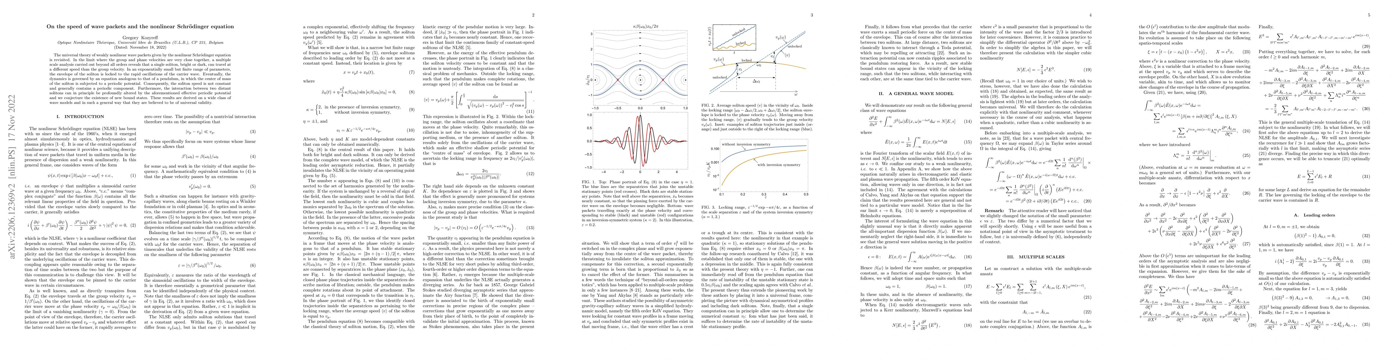 The universal theory of weakly nonlinear wave packets given by the nonlinear Schr\"odinger equation is revisited. In the limit where the group and phase velocities are very close together, a multiple scale analysis carried out beyond all orders reveals that a single soliton, bright or dark, can travel at a different speed than the group velocity. In an exponentially small but finite range of parameters, the envelope of the soliton is locked to the rapid oscillations of the carrier wave. Eventually, the dynamics is governed by an equation anologous to that of a pendulum, in which the center of mass of the soliton is subjected to a periodic potential. Consequently, the soliton speed is not constant and generally contains a periodic component. Furthermore, the interaction between two distant solitons can in principle be profoundly altered by the aforementioned effective periodic potential and we conjecture the existence of new bound states. These results are derived on a wide class of wave models and in such a general way that they are believed to be of universal validity.