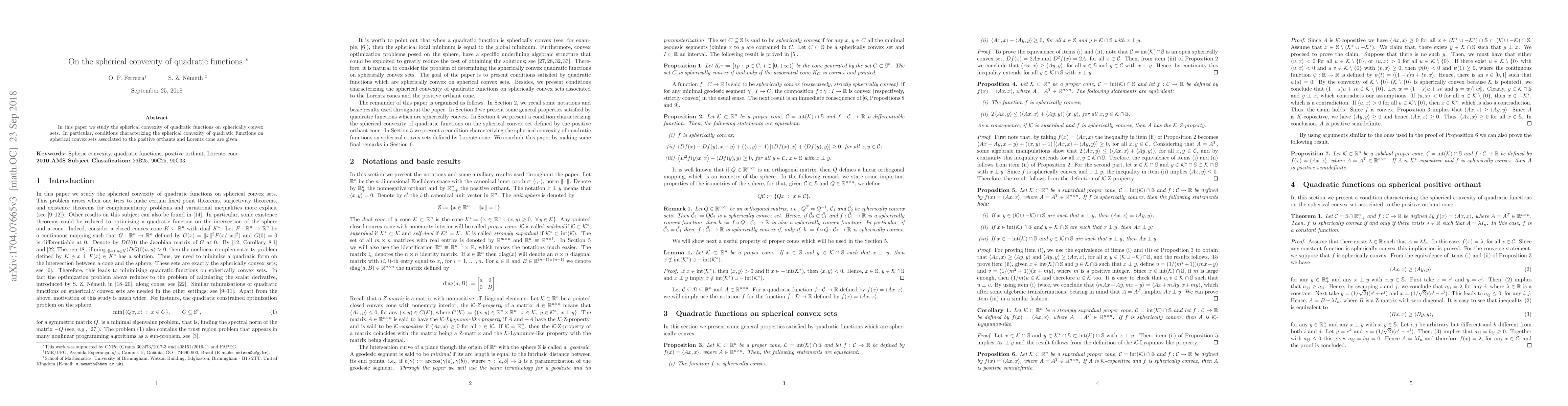This paper investigates the spherical convexity of quadratic functions defined on spherically convex sets, specifically focusing on conditions for such convexity in relation to positive orthants and Lorentz cones. The findings provide characterizations for the spherical convexity of these functions.
