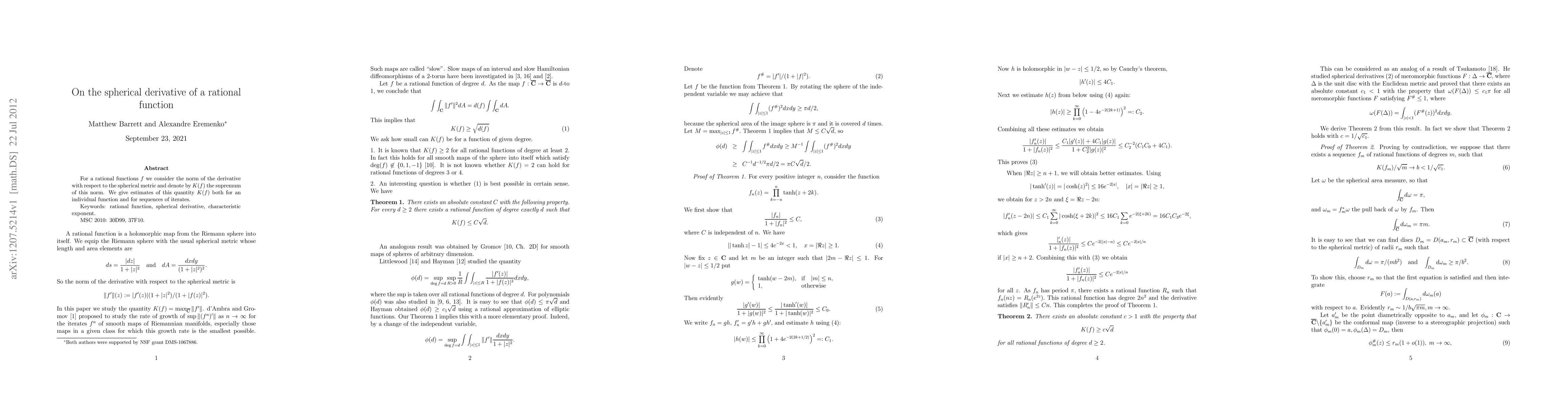 This paper investigates the spherical derivative of rational functions, defining K(f) as the supremum of the norm of the derivative under the spherical metric. It provides estimates for K(f) for both individual functions and sequences of iterates.