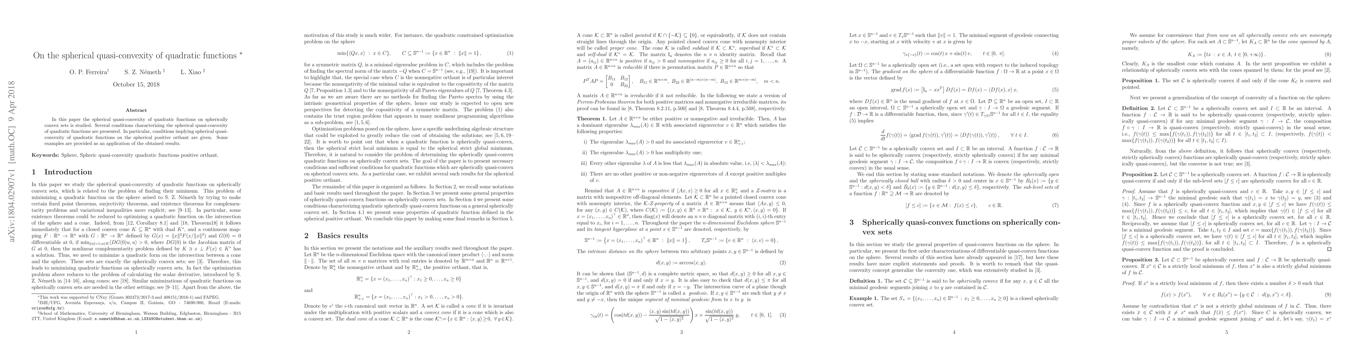 This paper investigates the spherical quasi-convexity of quadratic functions defined on spherically convex sets, presenting conditions that characterize this property. It specifically provides criteria for spherical quasi-convexity on the spherical positive orthant, supplemented by illustrative examples.