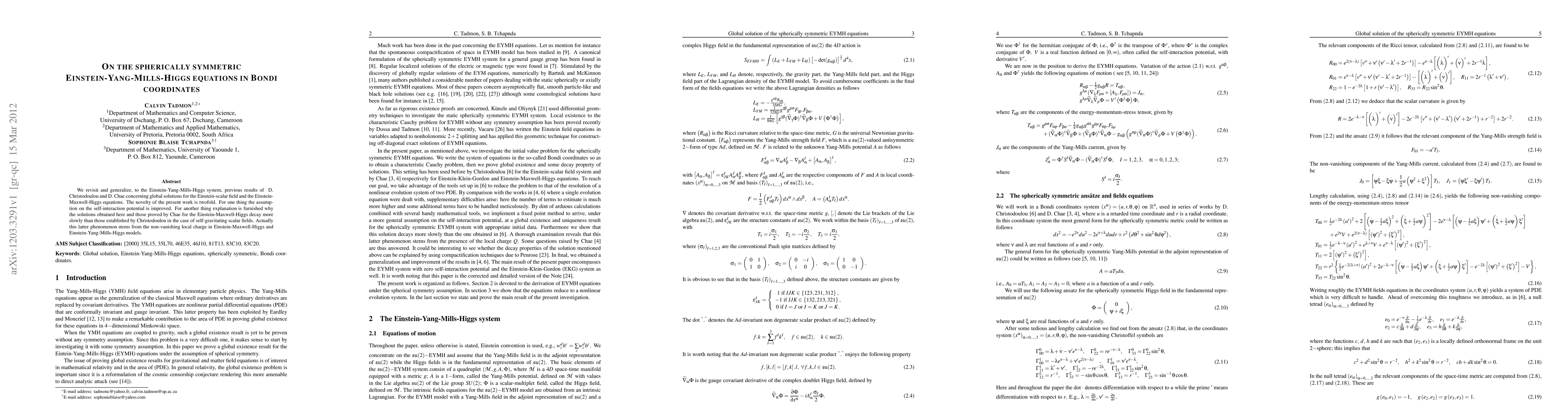 We revisit and generalize, to the Einstein-Yang-Mills-Higgs system, previous results of D. Christodoulou and D. Chae concerning global solutions for the Einstein-scalar field and the Einstein-Maxwell-Higgs equations. The novelty of the present work is twofold. For one thing the assumption on the self-interaction potential is improved. For another thing explanation is furnished why the solutions obtained here and those proved by Chae for the Einstein-Maxwell-Higgs decay more slowly than those established by Christodoulou in the case of self-gravitating scalar fields. Actually this latter phenomenon stems from the non-vanishing local charge in Einstein-Maxwell-Higgs and Einstein-Yang-Mills-Higgs models.