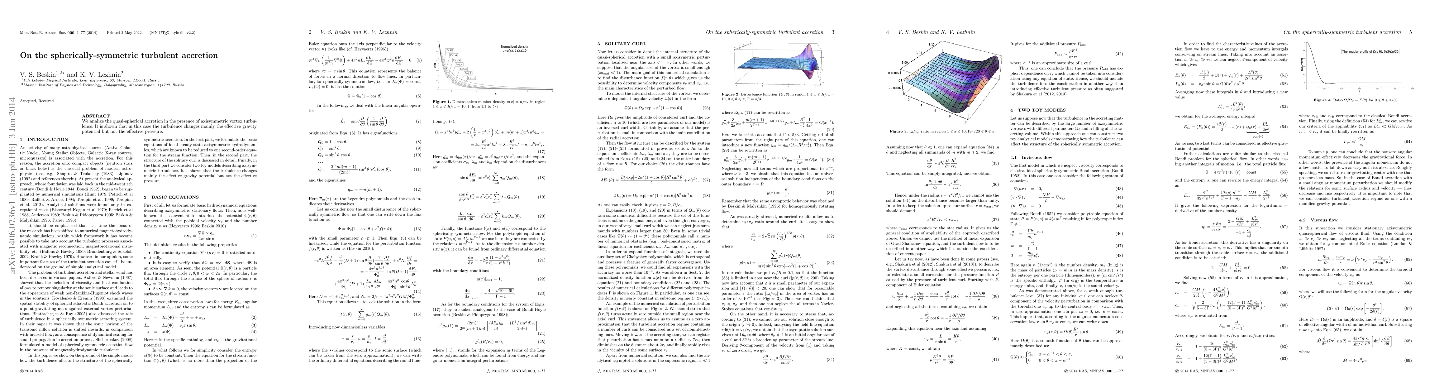 We analize the quasi-spherical accretion in the presence of axisymmetric vortex turbulence. It is shown that in this case the turbulence changes mainly the effective gravity potential but not the effective pressure.