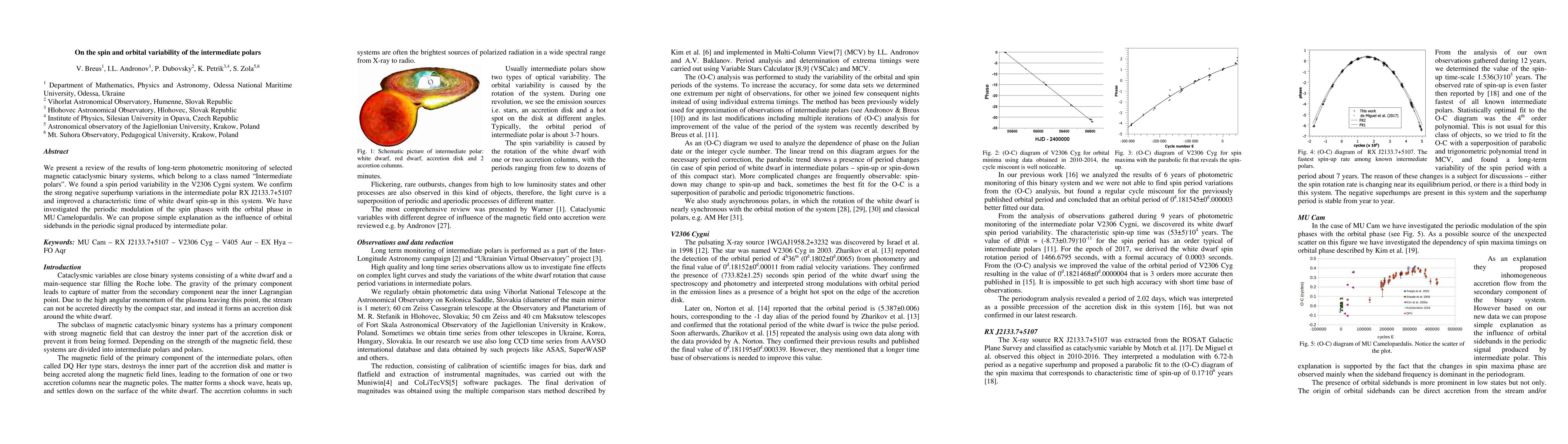 This paper reviews long-term photometric monitoring of intermediate polars, finding spin period variability in the V2306 Cygni system and confirming strong negative superhump variations in RX J2133.7+5107. The study also investigates the periodic modulation of spin phases with orbital phase in MU Camelopardalis, attributing it to orbital sidebands.