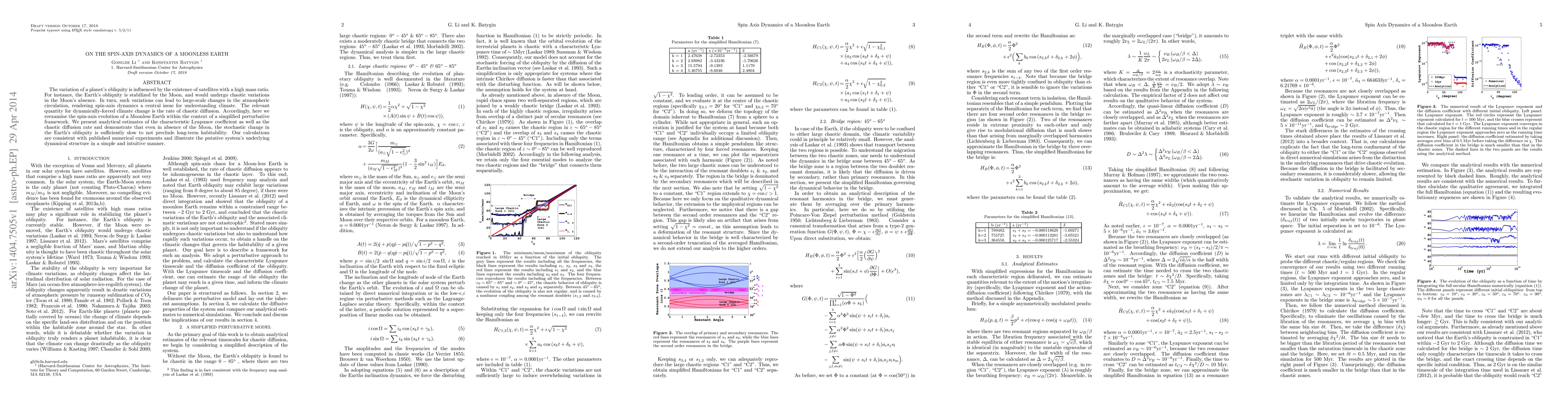 The variation of a planet's obliquity is influenced by the existence of satellites with a high mass ratio. For instance, the Earth's obliquity is stabilized by the Moon, and would undergo chaotic variations in the Moon's absence. In turn, such variations can lead to large-scale changes in the atmospheric circulation, rendering spin-axis dynamics a central issue for understanding climate. The relevant quantity for dynamically-forced climate change is the rate of chaotic diffusion. Accordingly, here we reexamine the spin-axis evolution of a Moonless Earth within the context of a simplified perturbative framework. We present analytical estimates of the characteristic Lyapunov coefficient as well as the chaotic diffusion rate and demonstrate that even in absence of the Moon, the stochastic change in the Earth's obliquity is sufficiently slow to not preclude long-term habitability. Our calculations are consistent with published numerical experiments and illustrate the putative system's underlying dynamical structure in a simple and intuitive manner.