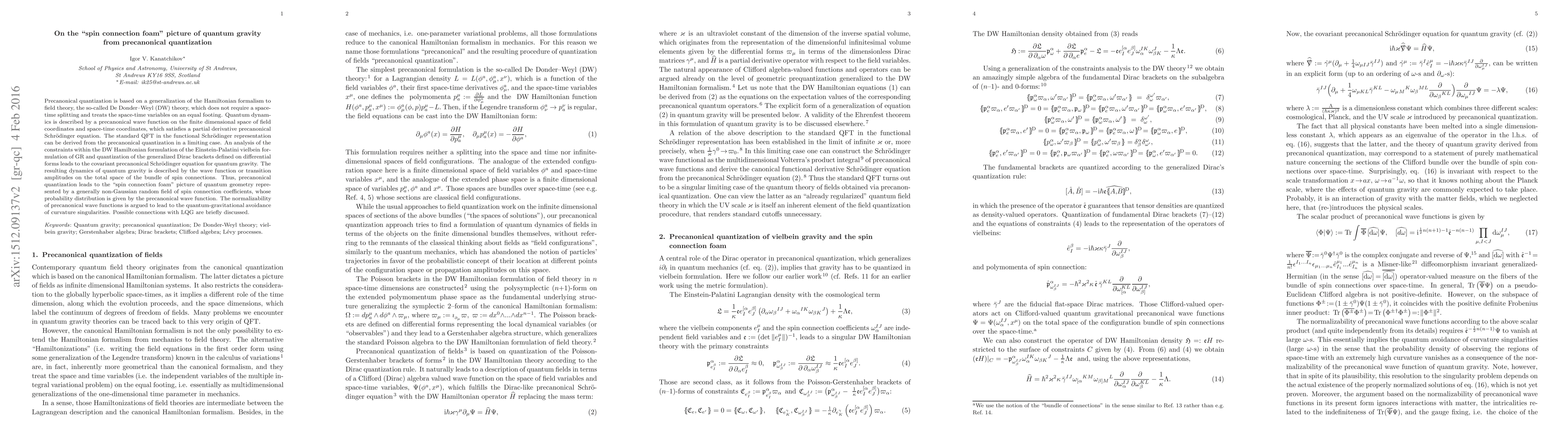 This paper explores quantum gravity through precanonical quantization using the De Donder-Weyl theory, leading to a "spin connection foam" picture where quantum geometry is represented by a non-Gaussian random field of spin connection coefficients. The approach avoids curvature singularities and hints at connections with Loop Quantum Gravity.