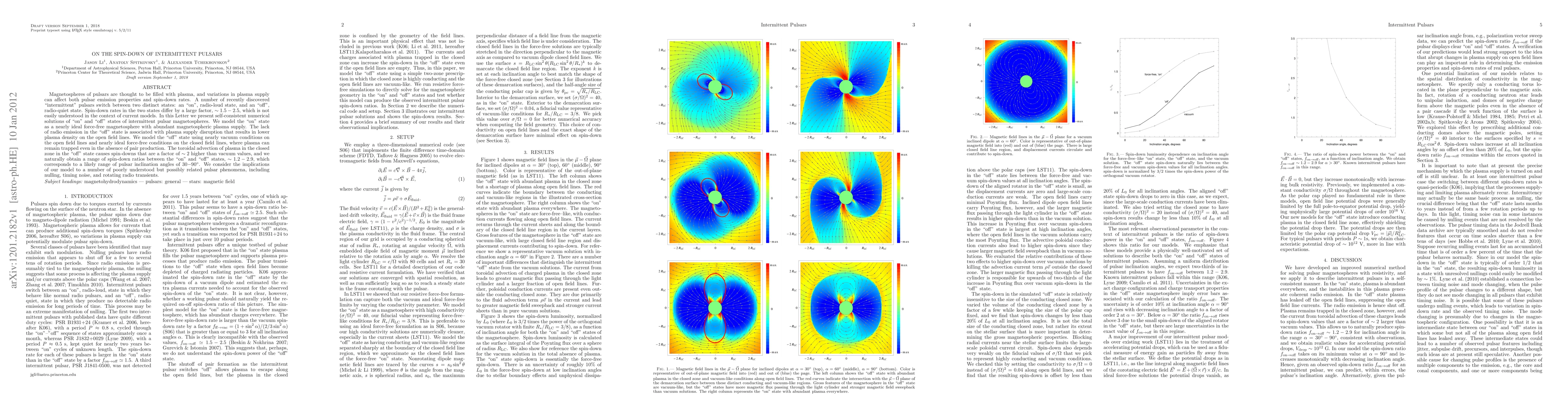 This paper investigates the spin-down rates of intermittent pulsars, which alternate between radio-loud and radio-quiet states. The study models the "on" state with abundant plasma and the "off" state with disrupted plasma supply, explaining the large spin-down rate differences through toroidal plasma advection in the "off" state.