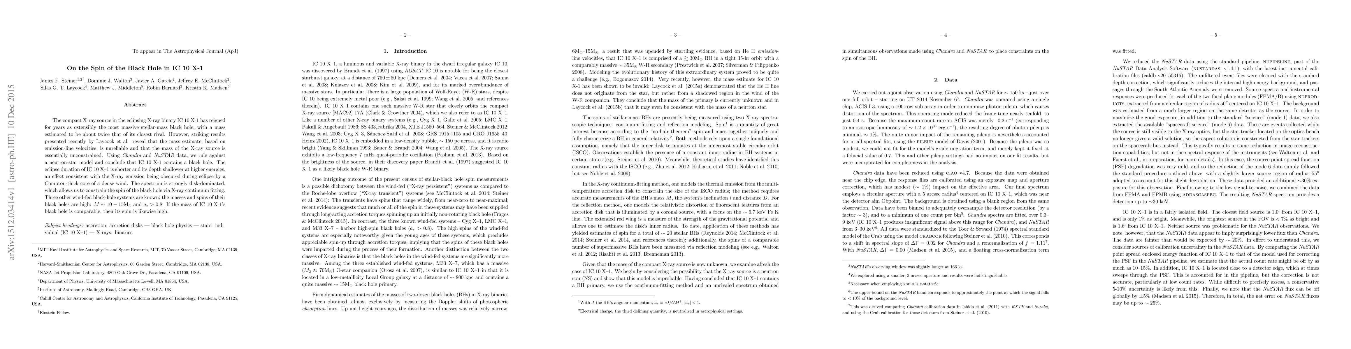 The compact X-ray source in the eclipsing X-ray binary IC 10 X-1 has reigned for years as ostensibly the most massive stellar-mass black hole, with a mass estimated to be about twice that of its closest rival. However, striking results presented recently by Laycock et al. reveal that the mass estimate, based on emission-line velocities, is unreliable and that the mass of the X-ray source is essentially unconstrained. Using Chandra and NuSTAR data, we rule against a neutron-star model and conclude that IC 10 X-1 contains a black hole. The eclipse duration of IC 10 X-1 is shorter and its depth shallower at higher energies, an effect consistent with the X-ray emission being obscured during eclipse by a Compton-thick core of a dense wind. The spectrum is strongly disk-dominated, which allows us to constrain the spin of the black hole via X-ray continuum fitting. Three other wind-fed black-hole systems are known; the masses and spins of their black holes are high: M ~ 10-15 Msun and a*>0.8. If the mass of IC 10 X-1's black hole is comparable, then its spin is likewise high.