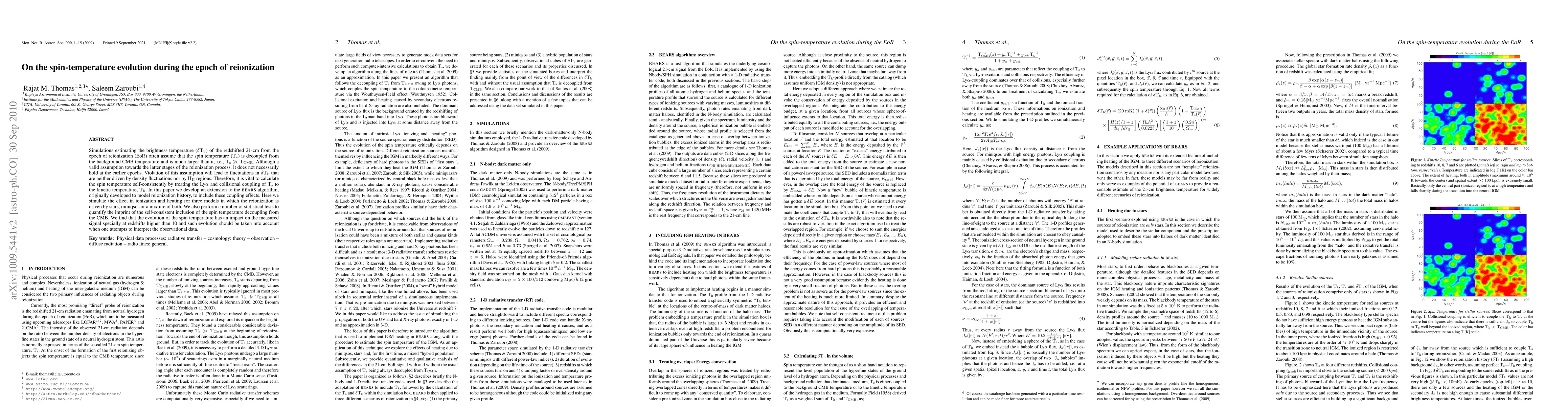 Simulations estimating the differential brightness temperature of the redshifted 21-cm from the epoch of reionization (EoR) often assume that the spin temperature is decoupled from the background CMB temperature and is much larger than it. Although a valid assumption towards the latter stages of the reionization process, it does not necessarily hold at the earlier epochs. Violation of this assumption will lead to fluctuations in differential brightness temperature that are neither driven by density fluctuations nor by HII regions. Therefore, it is vital to calculate the spin temperature self-consistently by treating the Lyman-alpha and collisional coupling of spin temperature to the kinetic temperature. In this paper we develop an extension to the BEARS algorithm, originally developed to model reionization history, to include these coupling effects. Here we simulate the effect in ionization and heating for three models in which the reionization is driven by stars, miniqsos or a mixture of both.We also perform a number of statistical tests to quantify the imprint of the self-consistent inclusion of the spin temperature decoupling from the CMB. We find that the evolution of the spin temperature has an impact on the measured signal specially at redshifts higher than 10 and such evolution should be taken into account when one attempts to interpret the observational data.