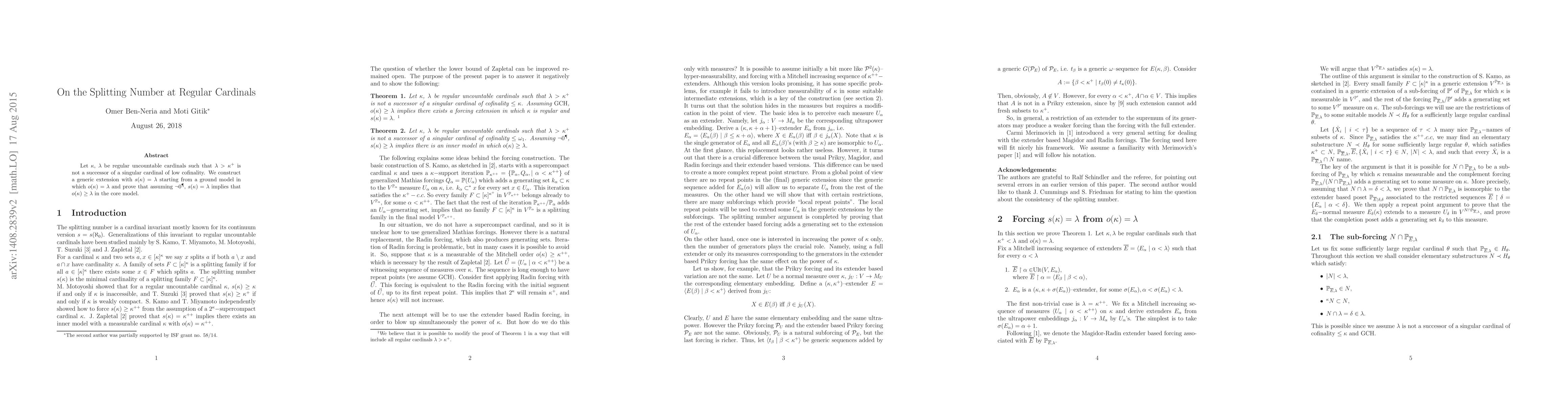This paper constructs a generic extension where the splitting number $s(\kappa)$ at a regular cardinal $\kappa$ equals a larger regular cardinal $\lambda$, starting from a ground model where the cofinality $o(\kappa)$ is also $\lambda$. It proves that under the assumption $\neg 0^{\P}$, $s(\kappa) = \lambda$ implies $o(\kappa) \geq \lambda$ in the core model.
