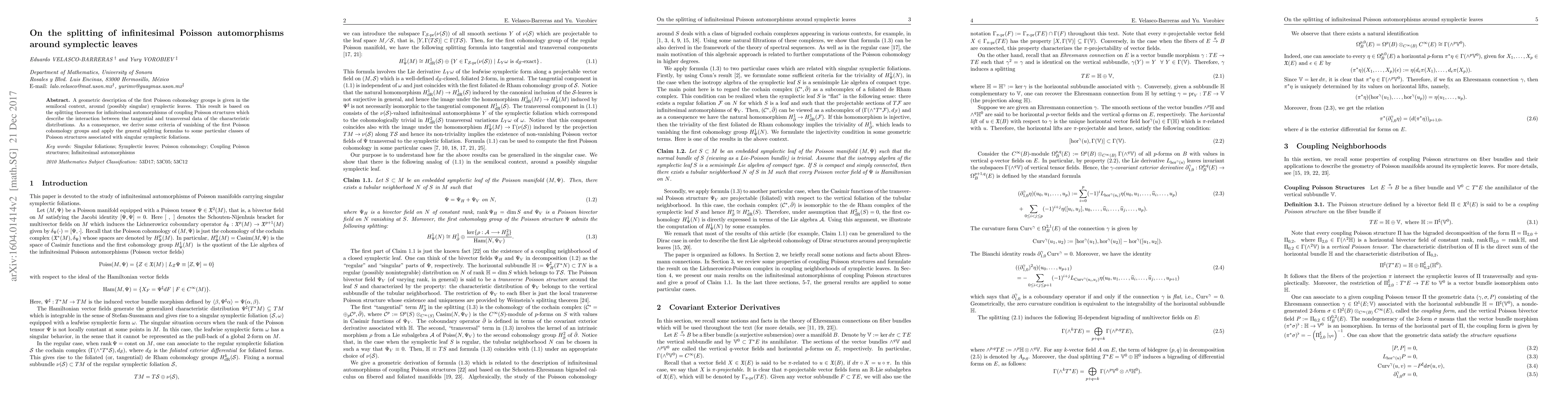 This paper provides a geometric description of first Poisson cohomology groups around symplectic leaves, using splitting theorems for infinitesimal automorphisms of coupling Poisson structures. It derives criteria for the vanishing of these cohomology groups and applies the results to specific classes of Poisson structures linked to singular symplectic foliations.