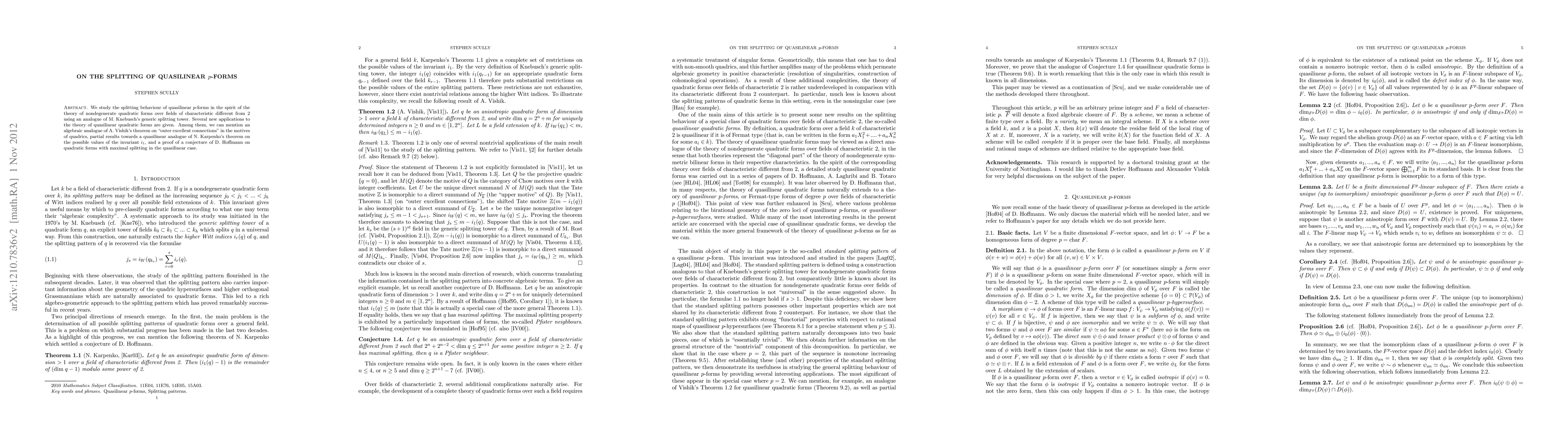 This paper explores the splitting behavior of quasilinear $p$-forms through the lens of nondegenerate quadratic forms, employing M. Knebusch's generic splitting tower. It provides new applications, including an algebraic analogue of Vishik's theorem on "outer excellent connections" and a proof of Hoffmann's conjecture on maximal splitting in quasilinear quadratic forms.