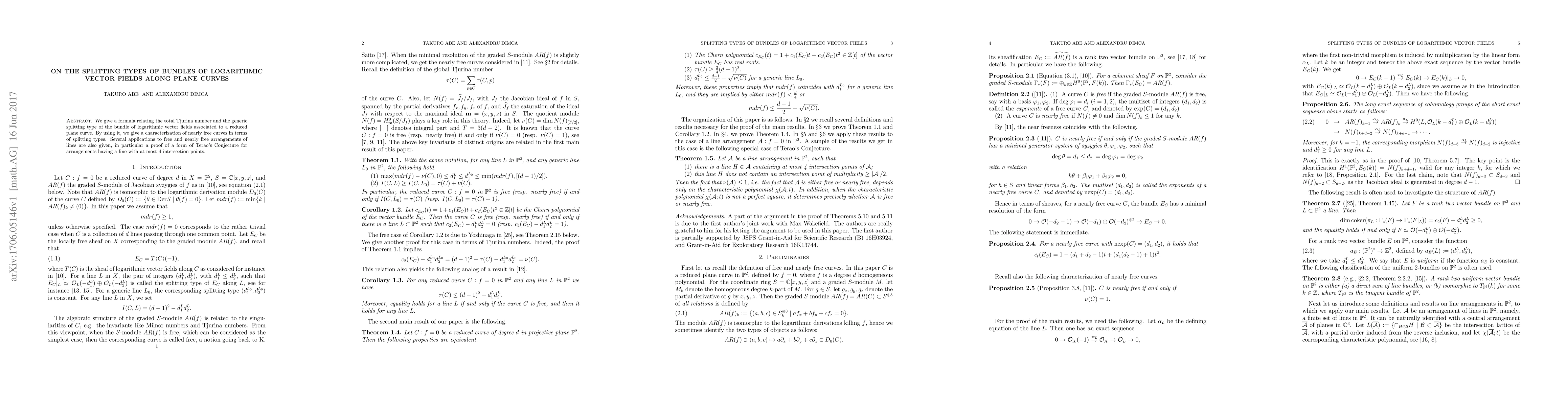 This paper establishes a relationship between the Tjurina number and the splitting type of bundles of logarithmic vector fields associated with plane curves, characterizing nearly free curves based on splitting types and proving a version of Terao's Conjecture for specific arrangements of lines.