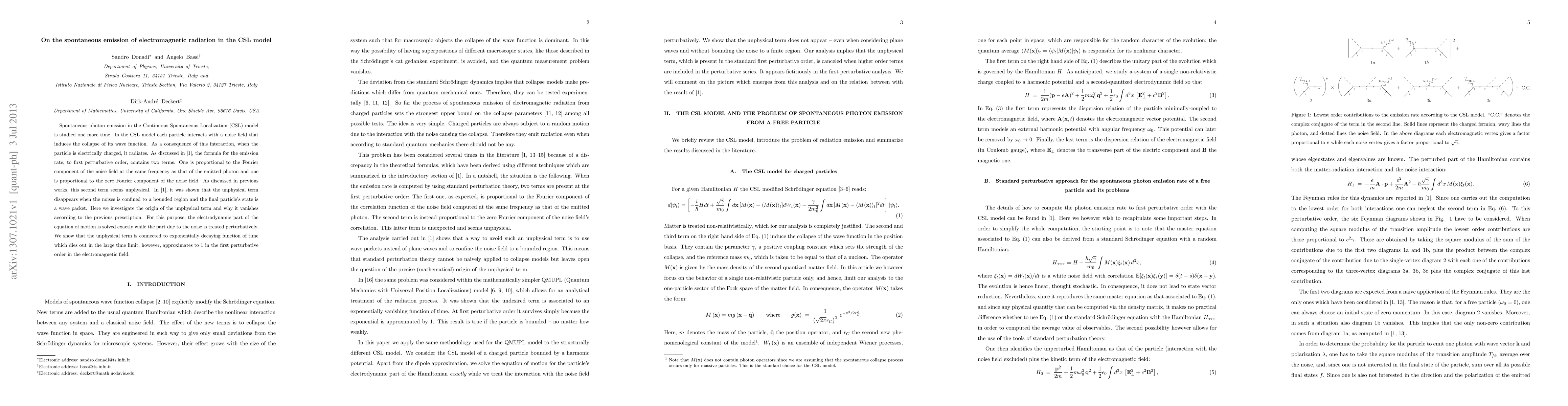 Spontaneous photon emission in the Continuous Spontaneous Localization (CSL) model is studied one more time. In the CSL model each particle interacts with a noise field that induces the collapse of its wave function. As a consequence of this interaction, when the particle is electrically charged, it radiates. As discussed in [1], the formula for the emission rate, to first perturbative order, contains two terms: One is proportional to the Fourier component of the noise field at the same frequency as that of the emitted photon and one is proportional to the zero Fourier component of the noise field. As discussed in previous works, this second term seems unphysical. In [1], it was shown that the unphysical term disappears when the noises is confined to a bounded region and the final particle's state is a wave packet. Here we investigate the origin of the unphysical term and why it vanishes according to the previous prescription. For this purpose, the electrodynamic part of the equation of motion is solved exactly while the part due to the noise is treated perturbatively. We show that the unphysical term is connected to exponentially decaying function of time which dies out in the large time limit, however, approximates to 1 in the first perturbative order in the electromagnetic field.