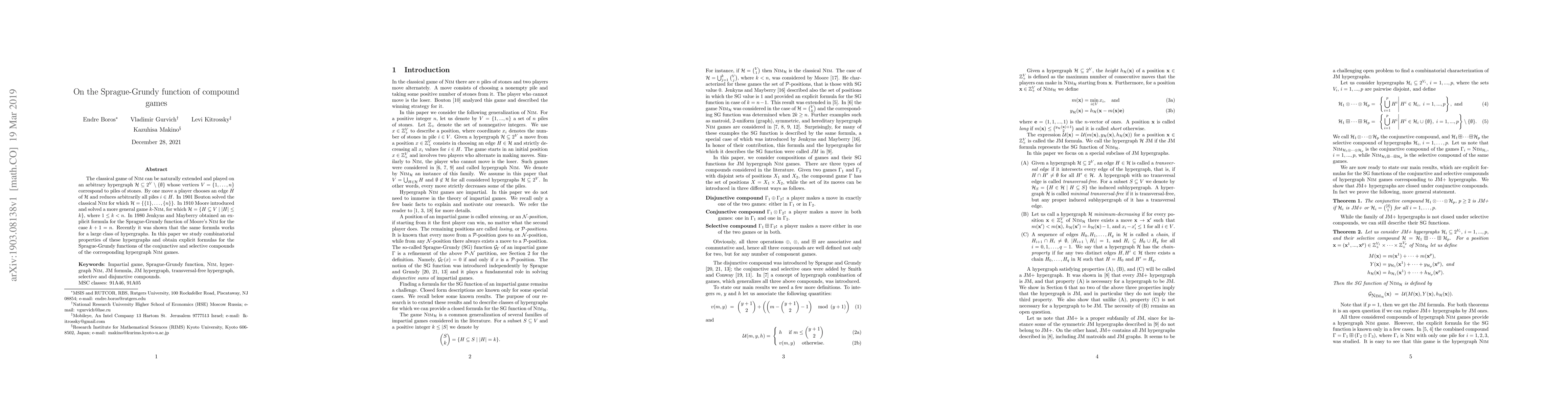 The classical game of {\sc Nim} can be naturally extended and played on an arbitrary hypergraph $\cH \subseteq 2^V \setminus \{\emptyset\}$ whose vertices $V = \{1, \ldots, n\}$ correspond to piles of stones. By one move a player chooses an edge $H$ of $\cH$ and reduces arbitrarily all piles $i \in H$. In 1901 Bouton solved the classical {\sc Nim} for which $\cH = \{\{1\}, \ldots, \{n\}\}$. In 1910 Moore introduced and solved a more general game $k$-{\sc Nim}, for which $\cH = \{H \subseteq V \mid |H| \leq k\}$, where $1 \leq k < n$. In 1980 Jenkyns and Mayberry obtained an explicit formula for the Sprague-Grundy function of Moore's {\sc Nim} for the case $k+1 = n$. Recently it was shown that the same formula works for a large class of hypergraphs. In this paper we study combinatorial properties of these hypergraphs and obtain explicit formulas for the Sprague-Grundy functions of the conjunctive and selective compounds of the corresponding hypergraph {\sc Nim} games.
